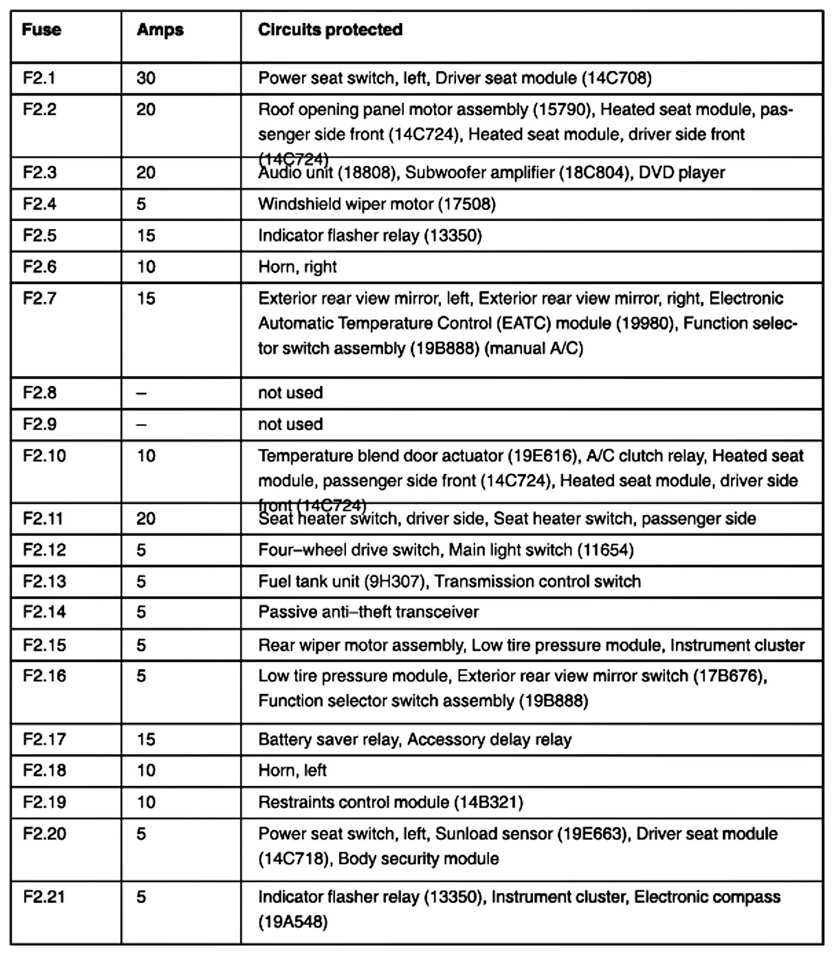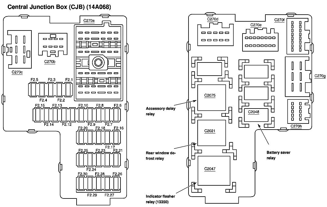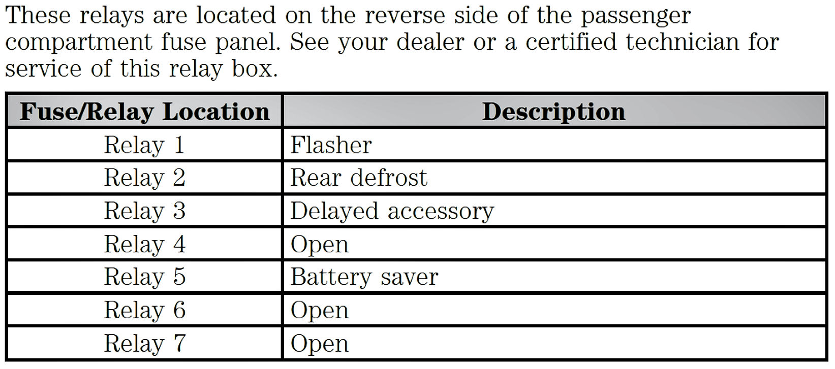 ALLDATA Editor's Note: Ford identifies this one component by 2 different names. Users have reported success comparing these images to determine Application/ID or Location of Fuses and Relays with the Central Junction Box/Passenger Compartment Fuse Panel.
