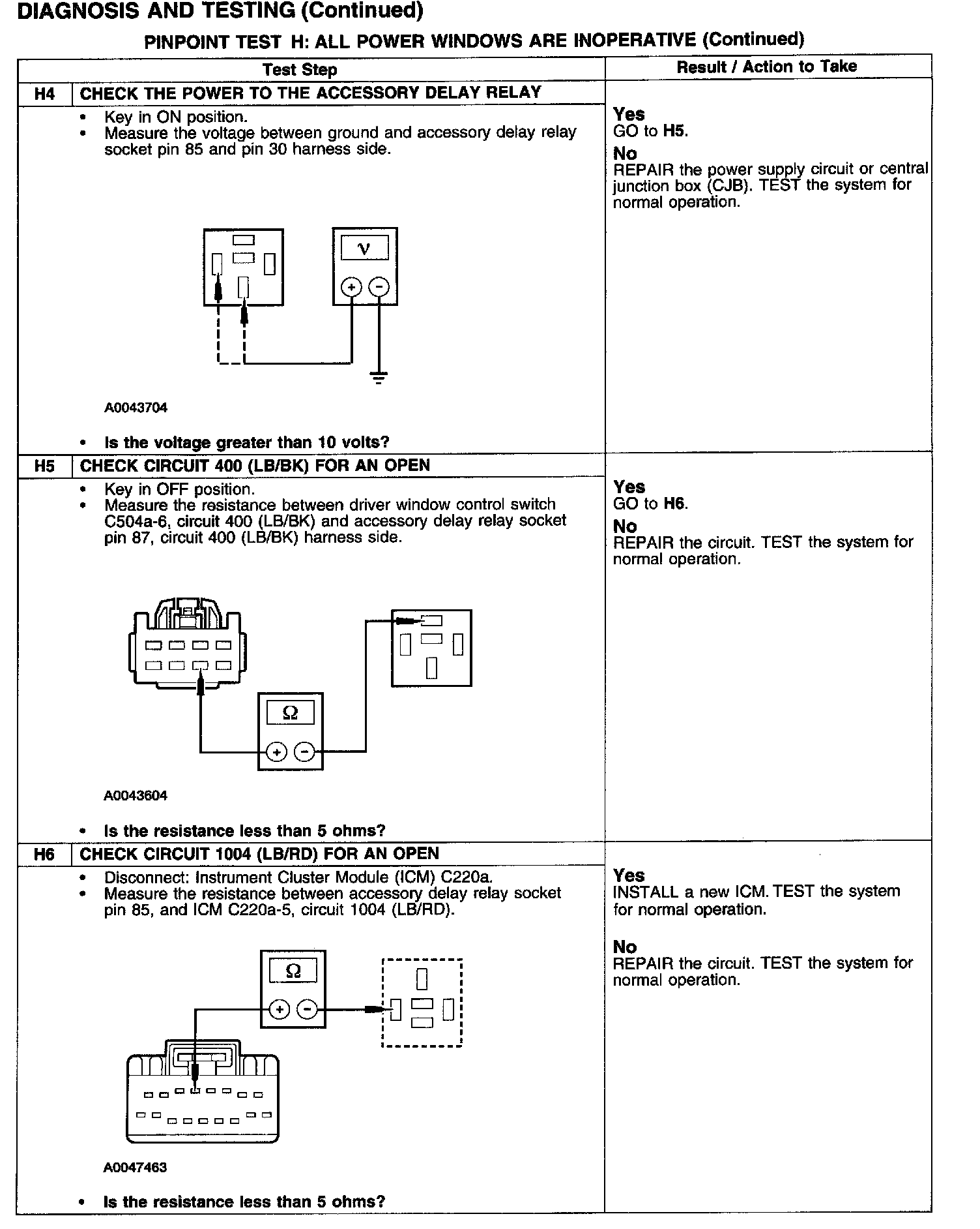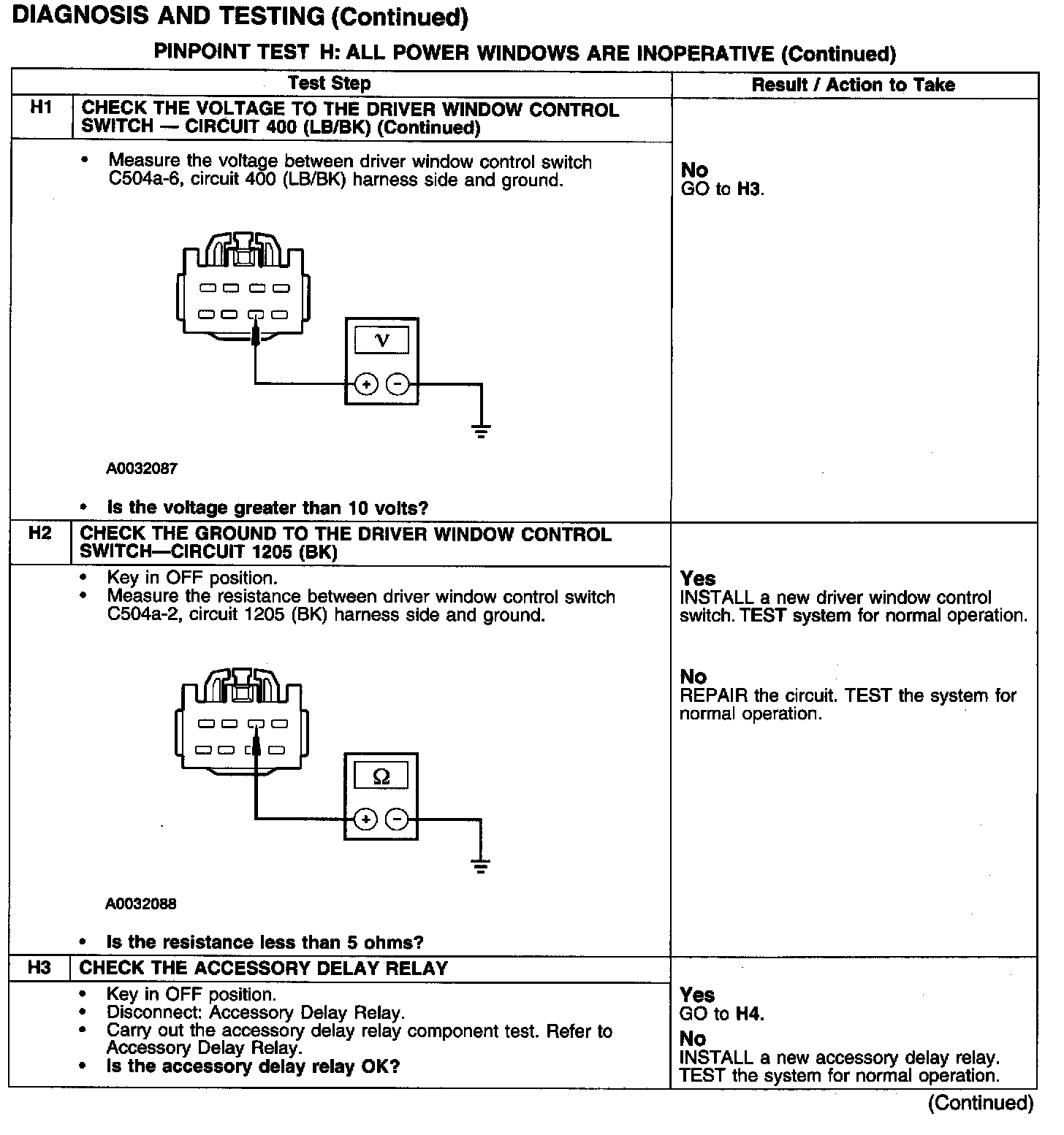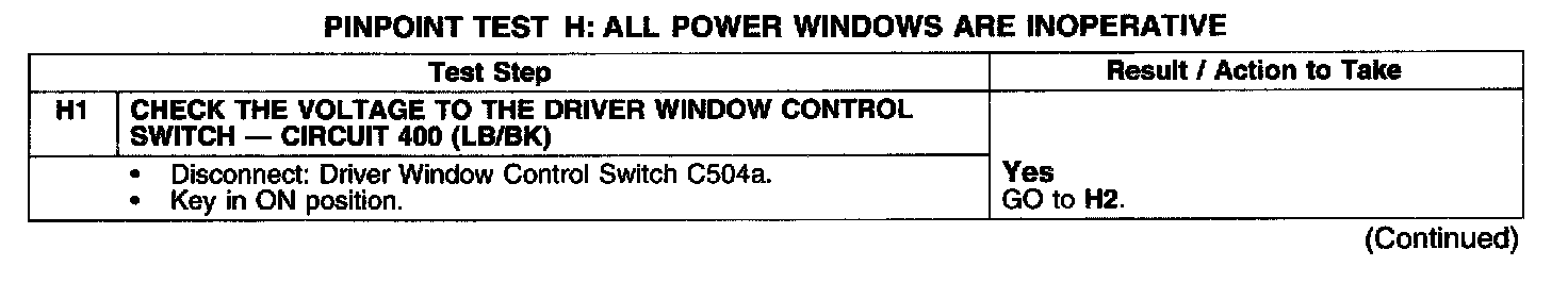 PINPOINT TEST H: ALL POWER WINDOWS ARE INOPERATIVETest H1: