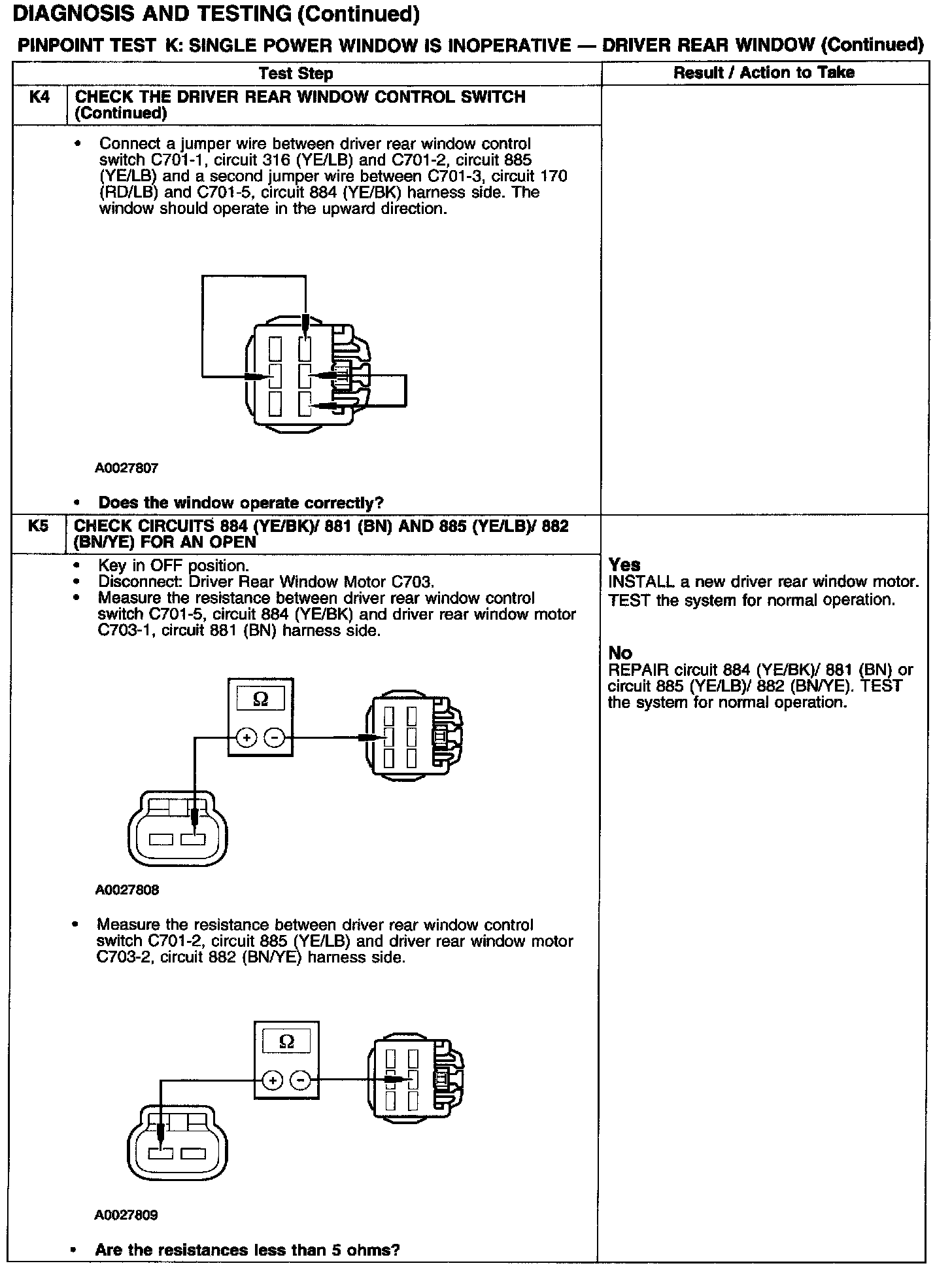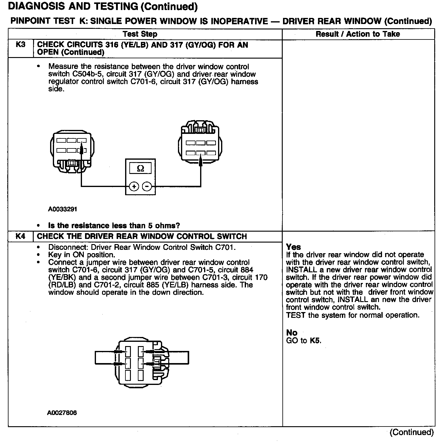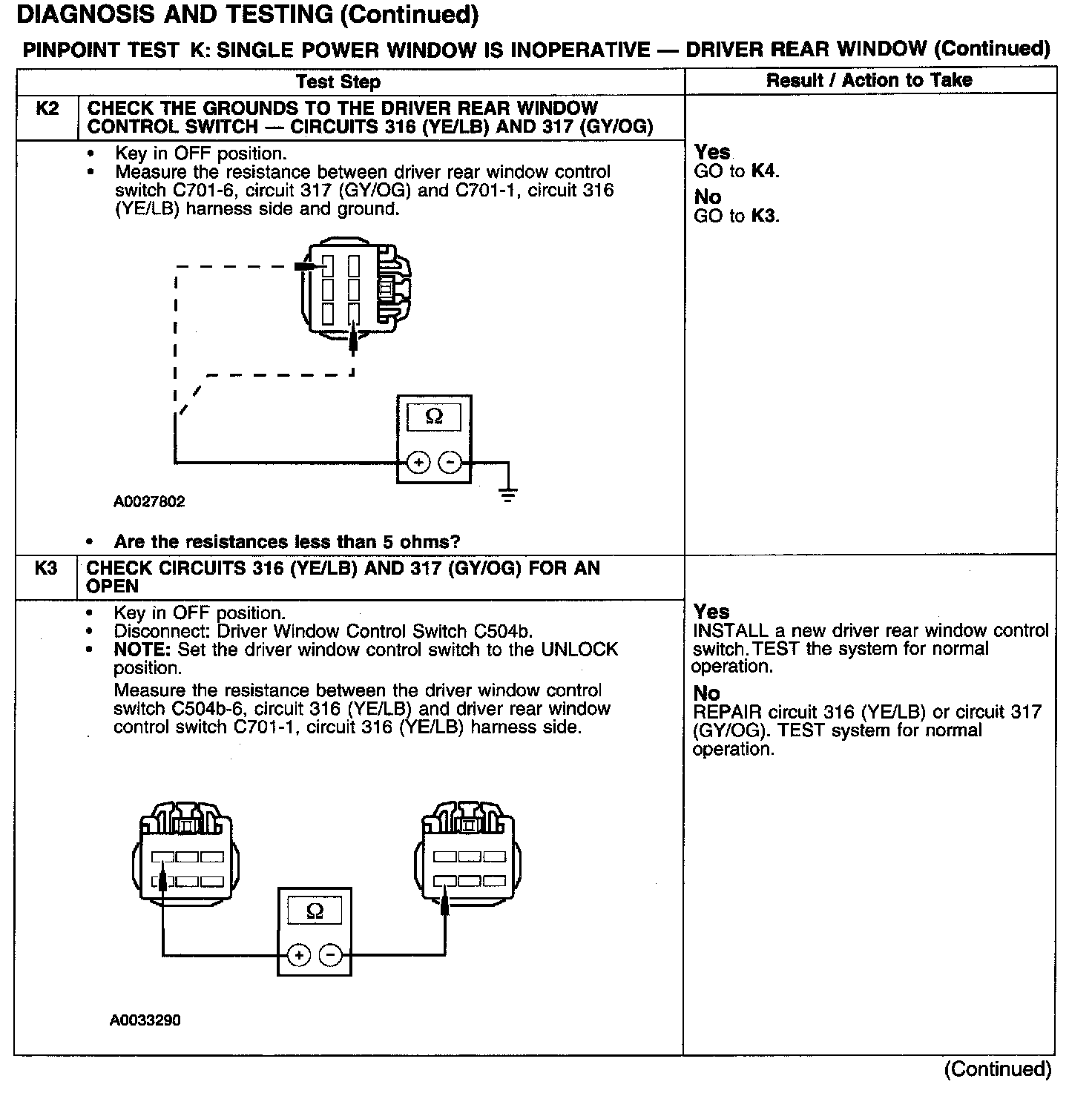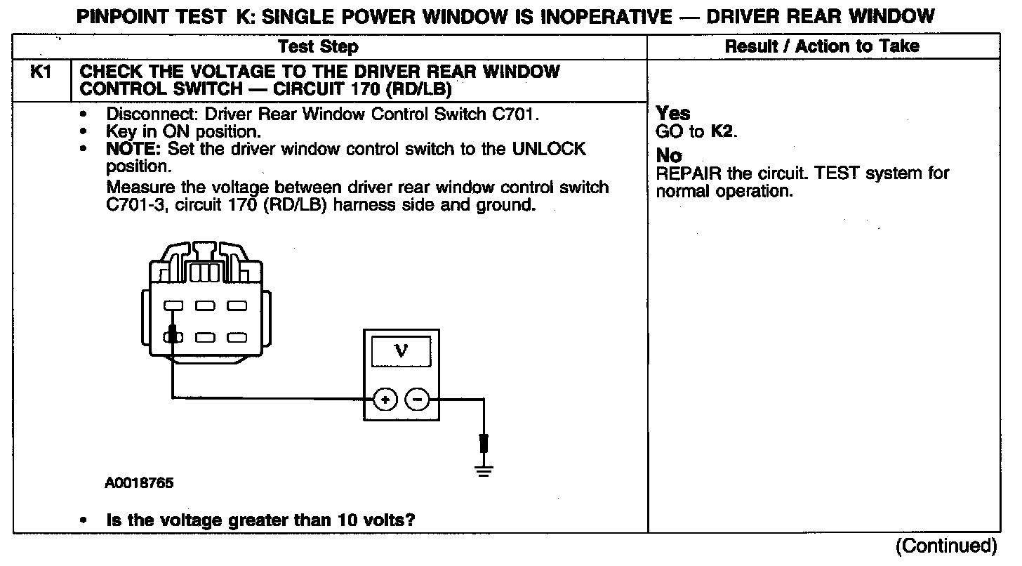PINPOINT TEST K: SINGLE POWER WINDOW IS INOPERATIVE - DRIVER REAR WINDOWTest K1: