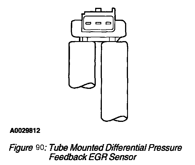 The tube mounted differential pressure feedback EGR sensor (Figure 89) is identical in operation as the larger metal or plastic DPFE sensors and uses a 1.0 volt offset. The HI and REF hose connections are marked on the underside of the sensor.