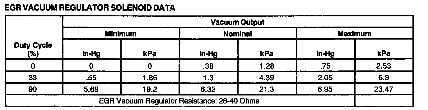 EGR Vacuum Regulator Solenoid Data Chart: