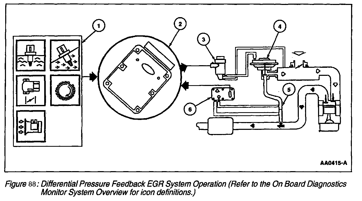 6. The differential pressure feedback EGR sensor measures the actual pressure drop across the metering orifice and relays a proportional voltage signal (0 to 5 volts) to the PCM. The PCM uses this feedback signal to correct for any errors in achieving the desired EGR flow.