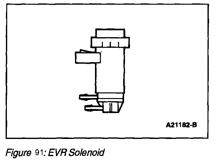 The EGR Vacuum Regulator Solenoid (EVR), (Figure 90) is an electromagnetic device which is used to regulate the vacuum supply to the EGR valve. The solenoid contains a coil which magnetically controls the position of a disc to regulate the vacuum. As the duty cycle to the coil increases, the vacuum signal passed through the solenoid to the EGR valve also increases. Vacuum not directed to the EGR valve is vented through the solenoid vent to atmosphere. Note that at 0% duty cycle (no electrical signal applied), the EGR vacuum regulator solenoid allows some vacuum to pass, but not enough to open the EGR valve.