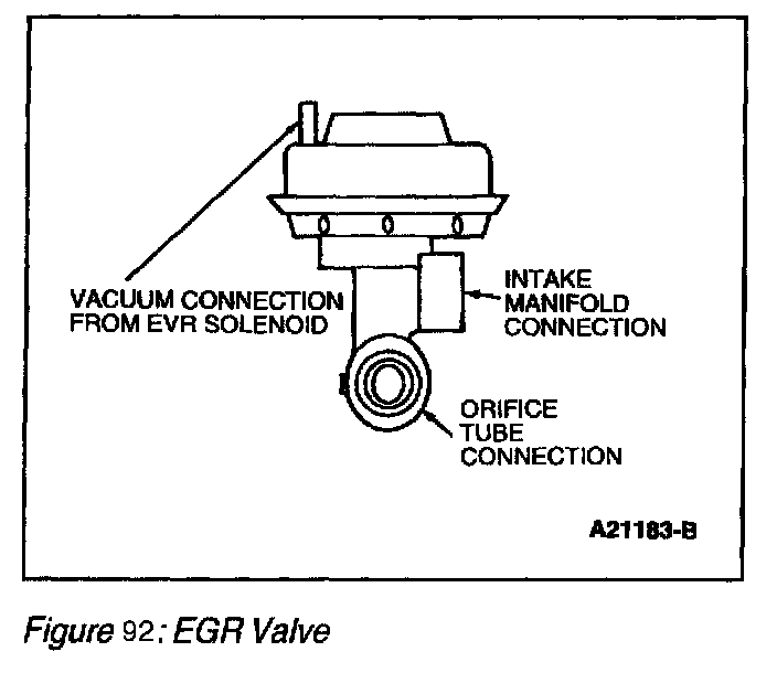 The EGR valve (Figure 91) in the Differential Pressure Feedback EGR system is a conventional, vacuum-actuated EGR valve. The valve increases or decreases the flow of exhaust gas recirculation. As vacuum applied to the EGR valve diaphragm overcomes the spring force, the valve begins to open. As the vacuum signal weakens, at 5.4 kPa (1.6 in-Hg) or less, the spring force closes the valve. The EGR valve is fully open at about 15 kPa (4.5 in-Hg).