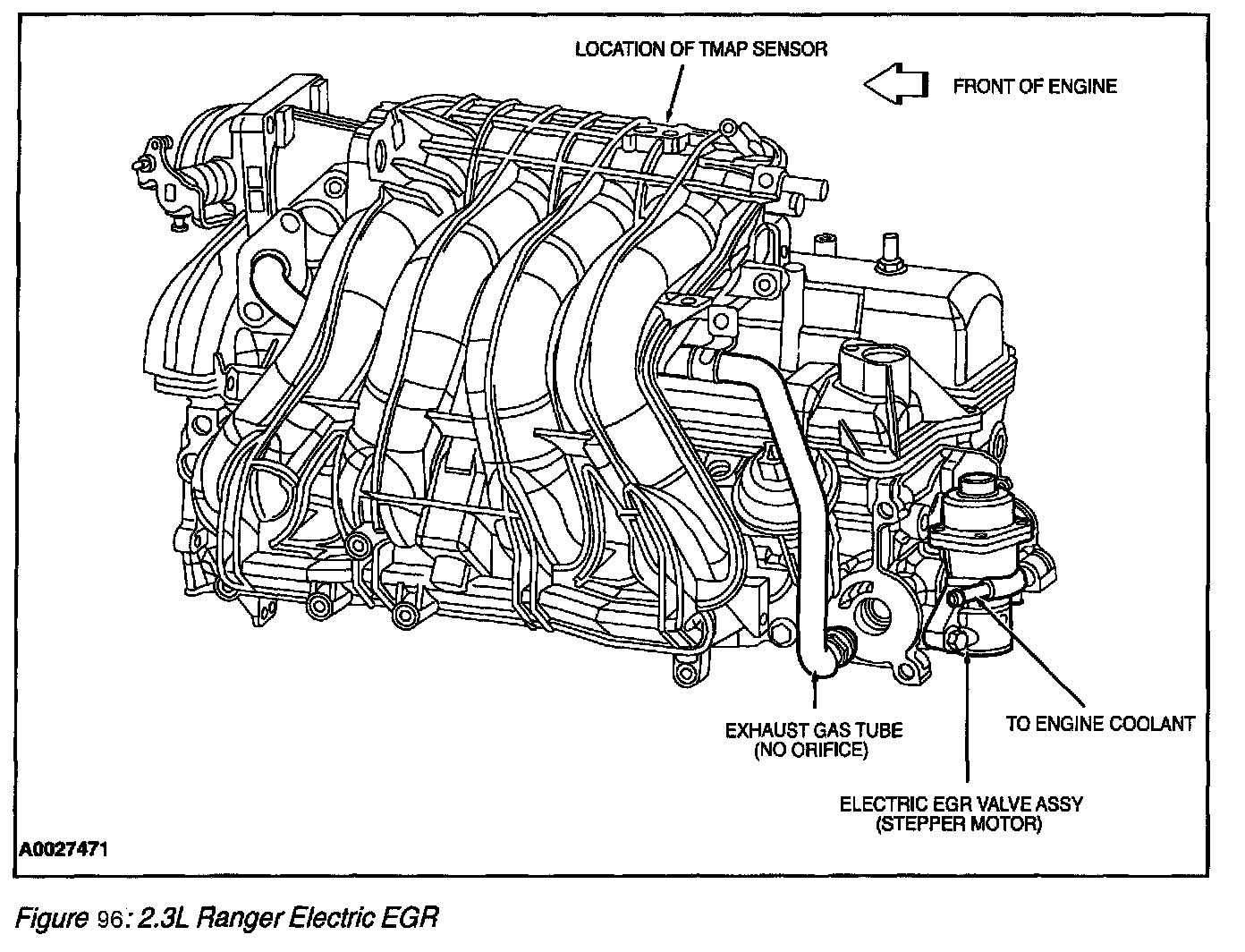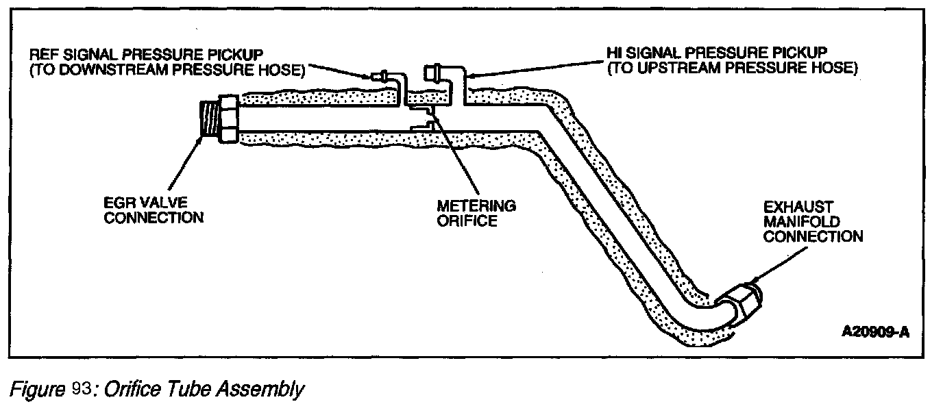 The orifice tube assembly (Figure 92) is a section of tubing connecting the exhaust system to the intake manifold. The assembly provides the flow path for the EGR to the intake manifold and also contains the metering orifice and two pressure pick-up tubes. The internal metering orifice creates a measurable pressure drop across it as the EGR valve opens and closes. This pressure differential across the orifice is picked up by the differential pressure feedback EGR sensor which provides feedback to the PCM.