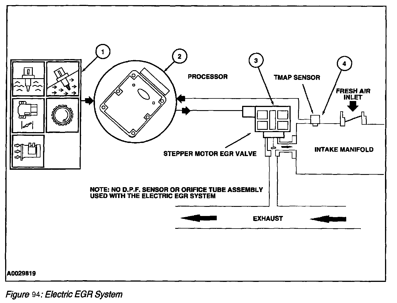 The EEGR system consists of an electric motor/EGR valve integrated assembly, a PCM, and connecting wiring. Additionally a MAP sensor is also required. Operation of the system is as follows (Figure 93):
