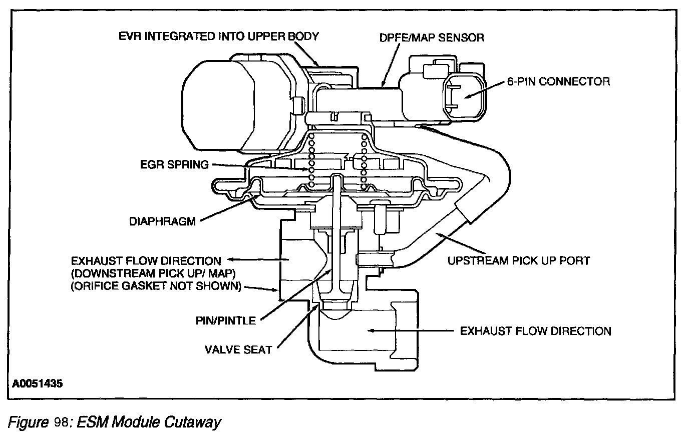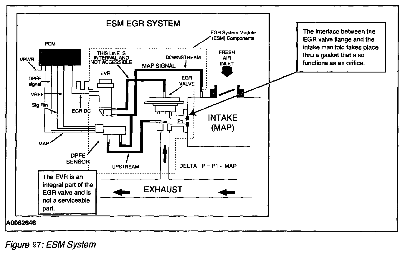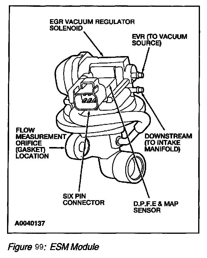 The ESM EGR system is an updated DPFE system. It functions in the same manner as the conventional DPFE system, however the various system components have been integrated into a single component called the EGR System Module (ESM) (Figure 96) The flange of the valve portion of the ESM bolts directly to the intake manifold with a metal gasket that forms the measuring orifice. This arrangement increases system reliability and response time. By relocating the EGR orifice from the exhaust to the intake side of the EGR valve, the downstream pressure signal measures Manifold Absolute Pressure (MAP). The system provides the PCM with a differential DPFE signal, identical to the traditional DPFE system.