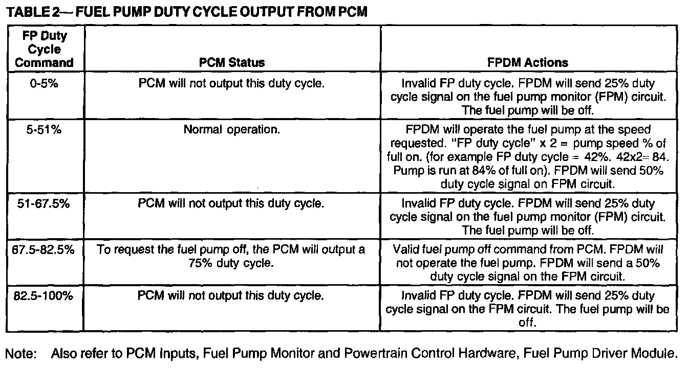 The Fuel Pump (FP) signal is a duty cycle command sent from the powertrain control module (PCM) to the fuel pump driver module (FPDM) (Table 2). The FPDM uses the FP command to operate the fuel pump at the speed requested by the PCM or to turn the pump off.