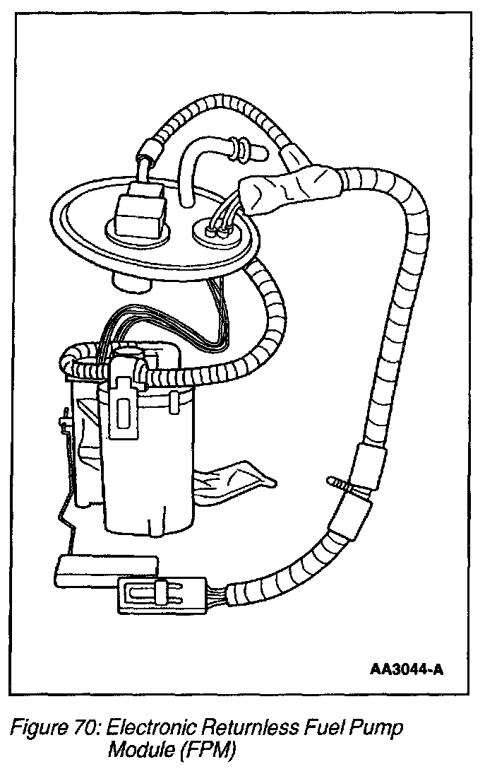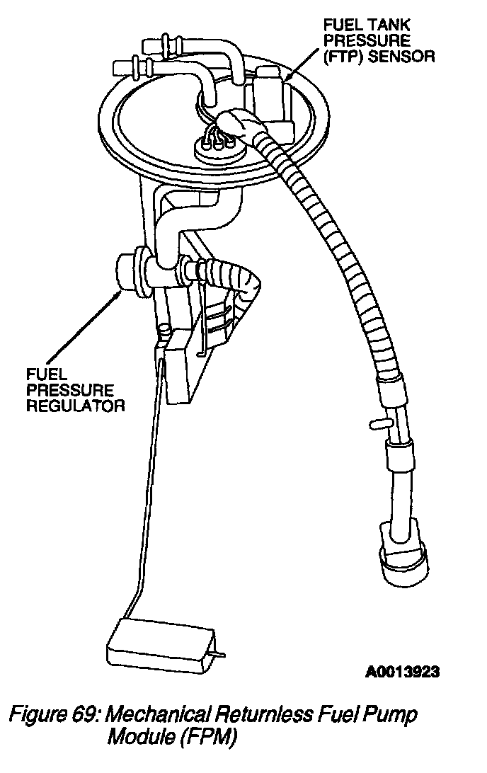 The fuel pump (FP) module (Figure 68),(Figure 69) and (Figure 70) is a device that contains the fuel pump and sender assembly. The fuel pump is located inside the FP module reservoir and supplies fuel through the FP module manifold to the engine and FP module jet pump. The jet pump continuously refills the reservoir with fuel, and a check valve located in the manifold outlet maintains system pressure when the fuel pump is not energized. A flapper valve located in the bottom of the reservoir allows fuel to enter the reservoir and prime the fuel pump during the initial fill.