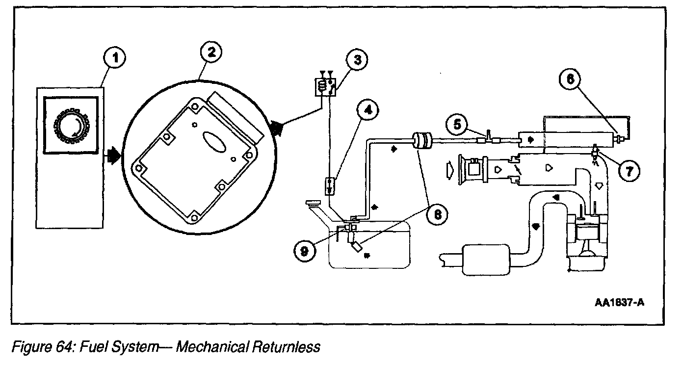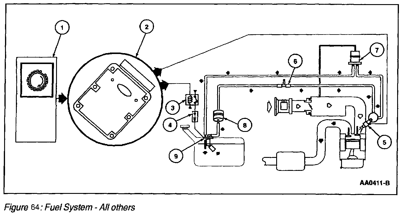 The fuel system consists of a fuel tank with reservoir, fuel pump, fuel pressure regulator, fuel filter, fuel supply line, fuel rail, fuel rail pulse damper, fuel injectors, and schrader/pressure test point. Operation of the system is as follows (Figure 64):
