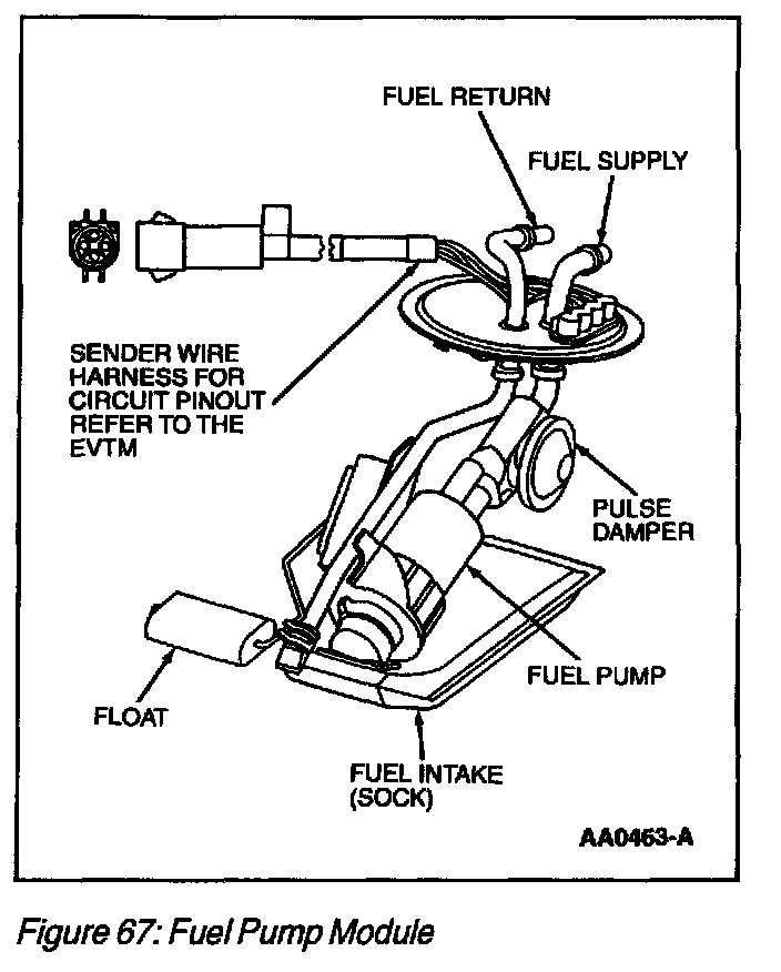 The fuel pump module (Figure 67) is mounted inside the fuel tank in a reservoir. The pump has a discharge check valve that maintains system pressure after the ignition key has been turned off to minimize starting concerns. The reservoir prevents fuel flow interruptions during extreme vehicle maneuvers with low tank fill levels.