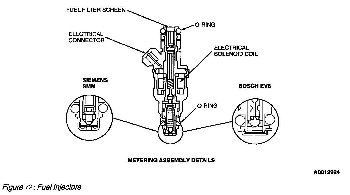 The fuel injector (Figure 71) is a solenoid-operated valve that meters fuel flow to the engine. The fuel injector is opened and closed a constant number of times per crankshaft revolution. The amount of fuel is controlled by the length of time the fuel injector is held open.