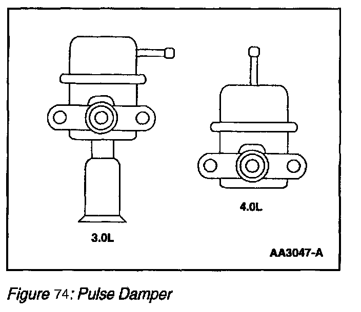 The fuel rail pulse damper (Figure 73) located on the fuel rail reduces fuel system noise caused by the pulsing of the fuel injectors. The vacuum port located on the damper is connected to manifold vacuum to avoid fuel spillage in the event the pulse damper diaphragm were to rupture. (The pulse damper should not be confused with a fuel pressure regulator, it does not regulate fuel rail pressure.)