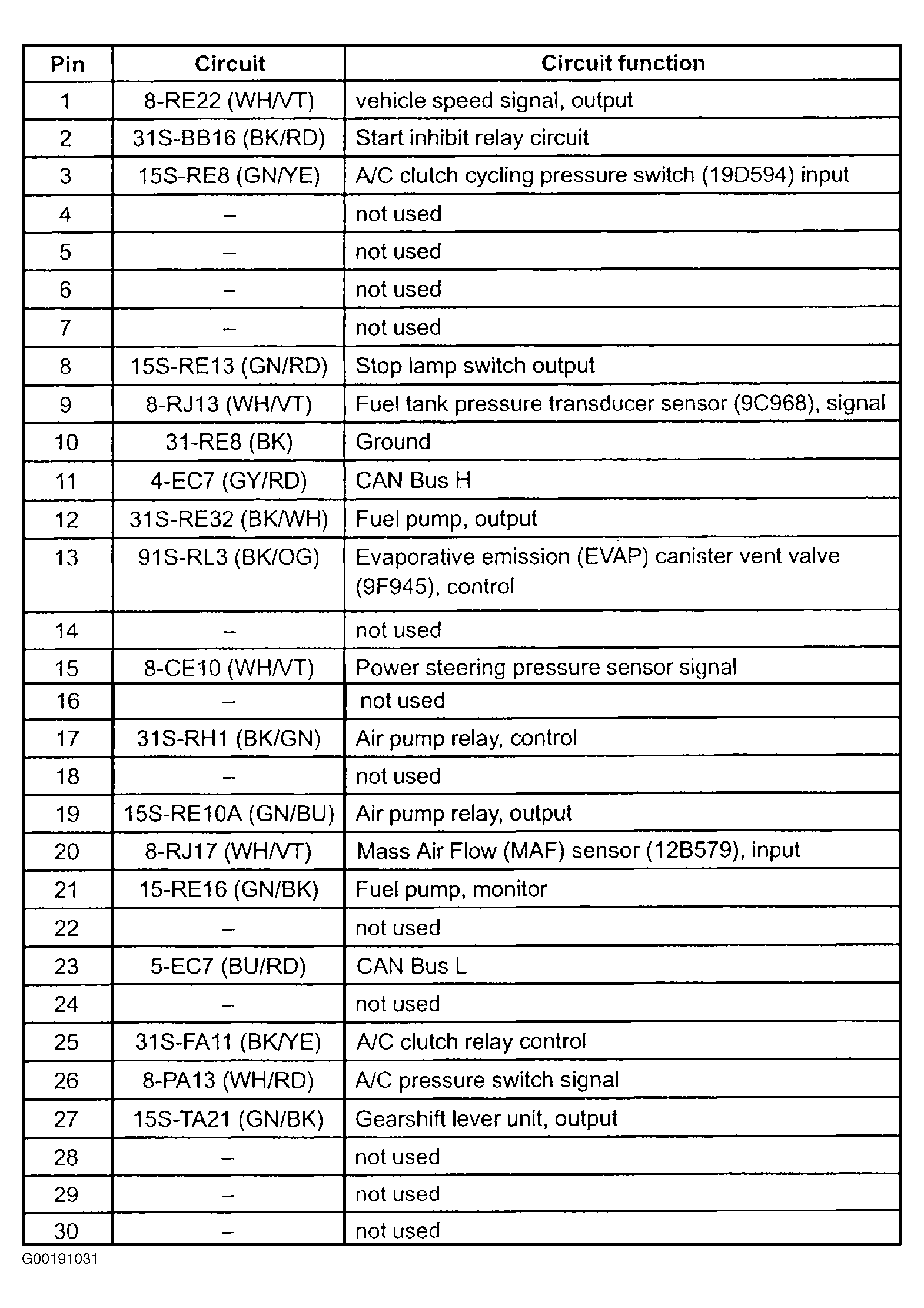 Pcm Connector End View & Pcm Connector Circuit Functions (Focus 2.3L)