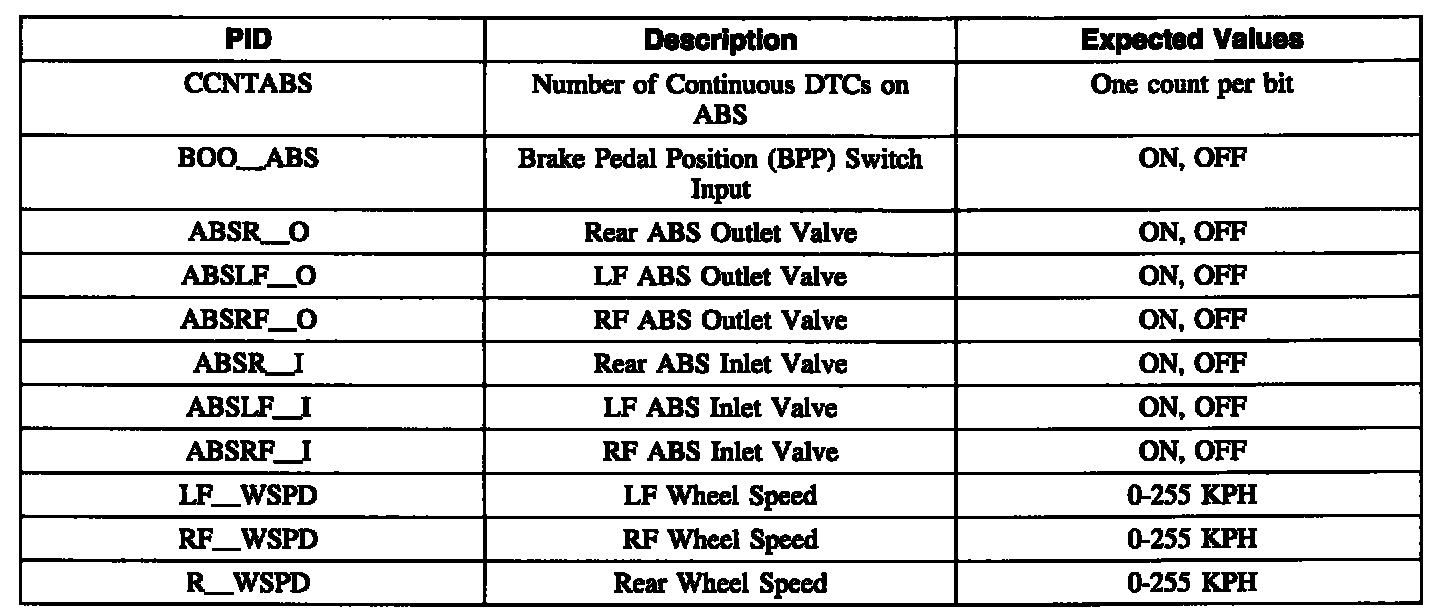 ABS Control Module Parameter Identification (PID) Index