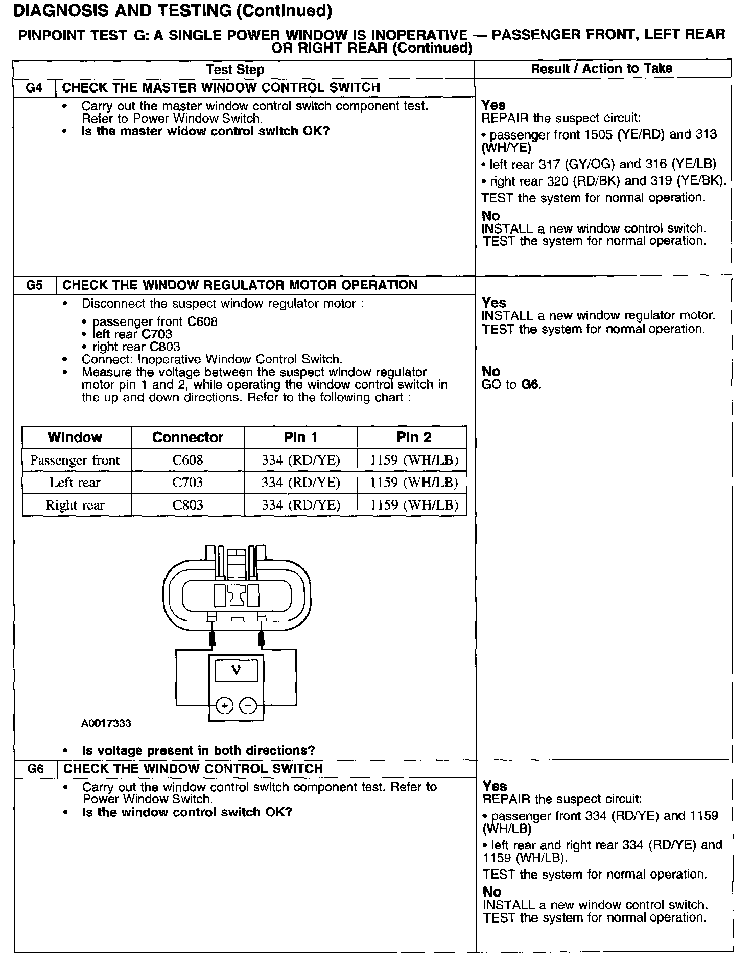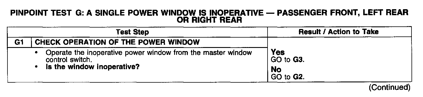 PINPOINT TEST G: A SINGLE POWER WINDOW IS INOPERATIVE - PASSENGER FRONT, LEFT REAR OR RIGHT REAR