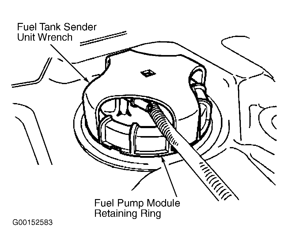 - Using Fuel Tank Sender Unit Wrench (310-069), remove fuel pump module retaining ring. See Fig 2. Remove fuel pump module from fuel tank. Ensure areas around fuel pump mounting area and fuel pump module flange are clean. When installing fuel pump module, align locator tabs on fuel tank mounting flange. See Fig 3. Install fuel tank assembly. To complete installation, reverse removal procedure. Tighten fasteners to specification. See TORQUE SPECIFICATIONS .
