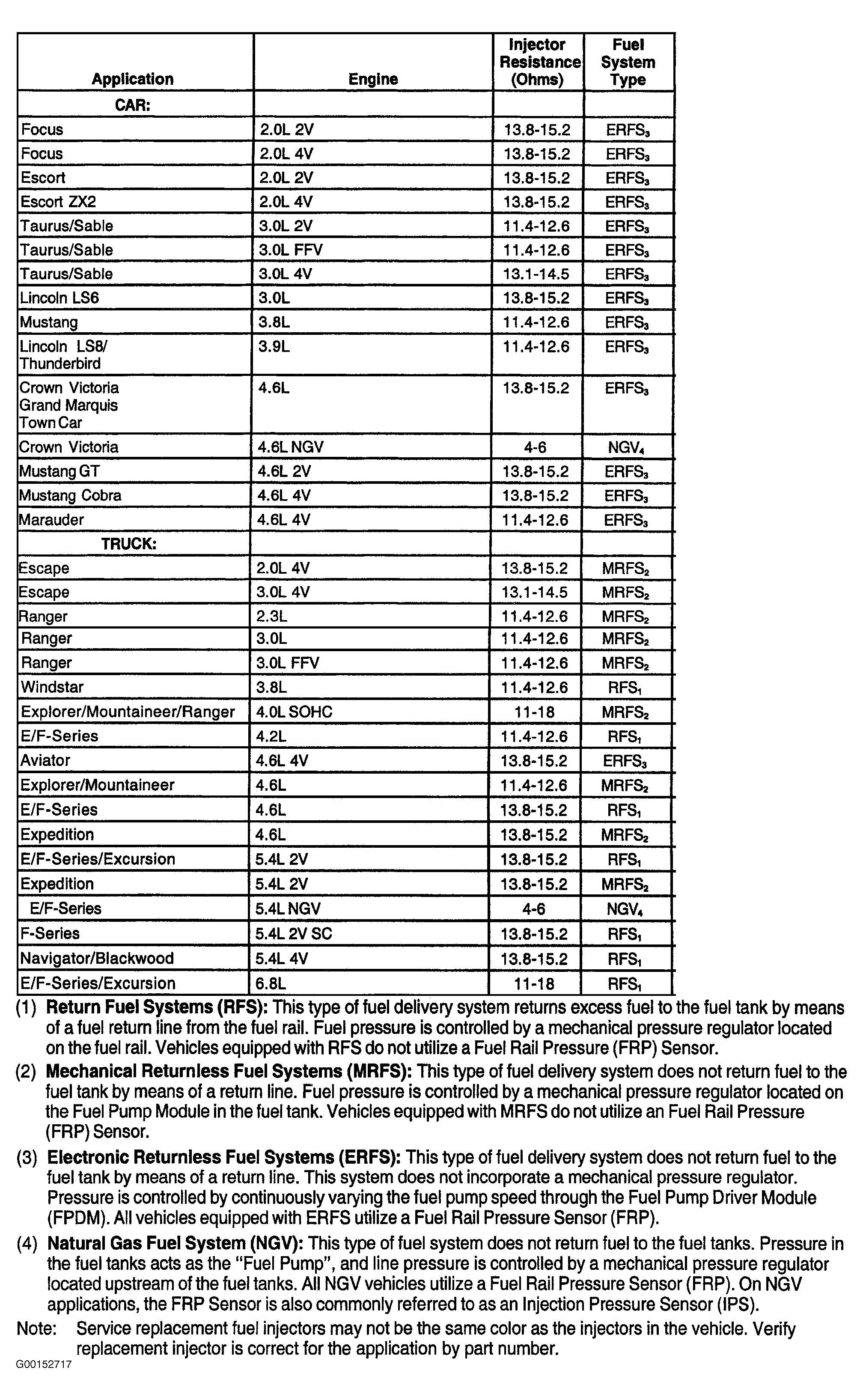 Turn ignition switch to OFF position. Disconnect PCM connector(s). Inspect connector for loose, damaged or corroded terminals. Repair as necessary. Using a DVOM, measure resistance between suspect fuel injector signal and VPWR circuits at PCM harness connector. See Figure. See PCM FUEL INJECTOR, PWR GND & VPWR CIRCUIT TERMINAL IDENTIFICATION table for PCM injector terminal identification. Fuel injector resistance should be within specification. See Figure. If fuel injector resistance is within specification, replace PCM. If fuel injector resistance is not within specification, go to TEST H, step 57). - 10) Check Fuel Pressure