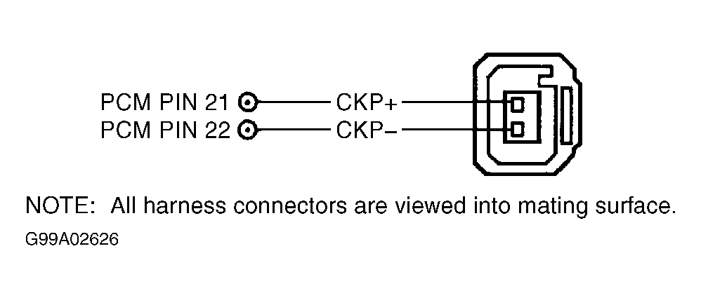 Turn ignition switch to OFF position. Disconnect PCM. Measure resistance of CKP(+) and CKP(-) circuits individually between the PCM harness connector and the CKP harness connector. Is either resistance measurement greater than 5 ohms? If yes, repair open circuit. If no, go to next step.