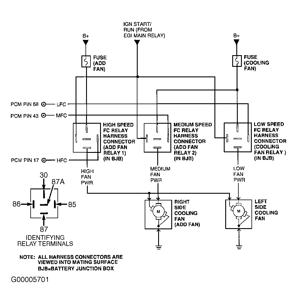 - On all models, shake, wiggle and bend VPWR (or IGN START/RUN) circuit to MFC (or ADD FAN 3) relay.