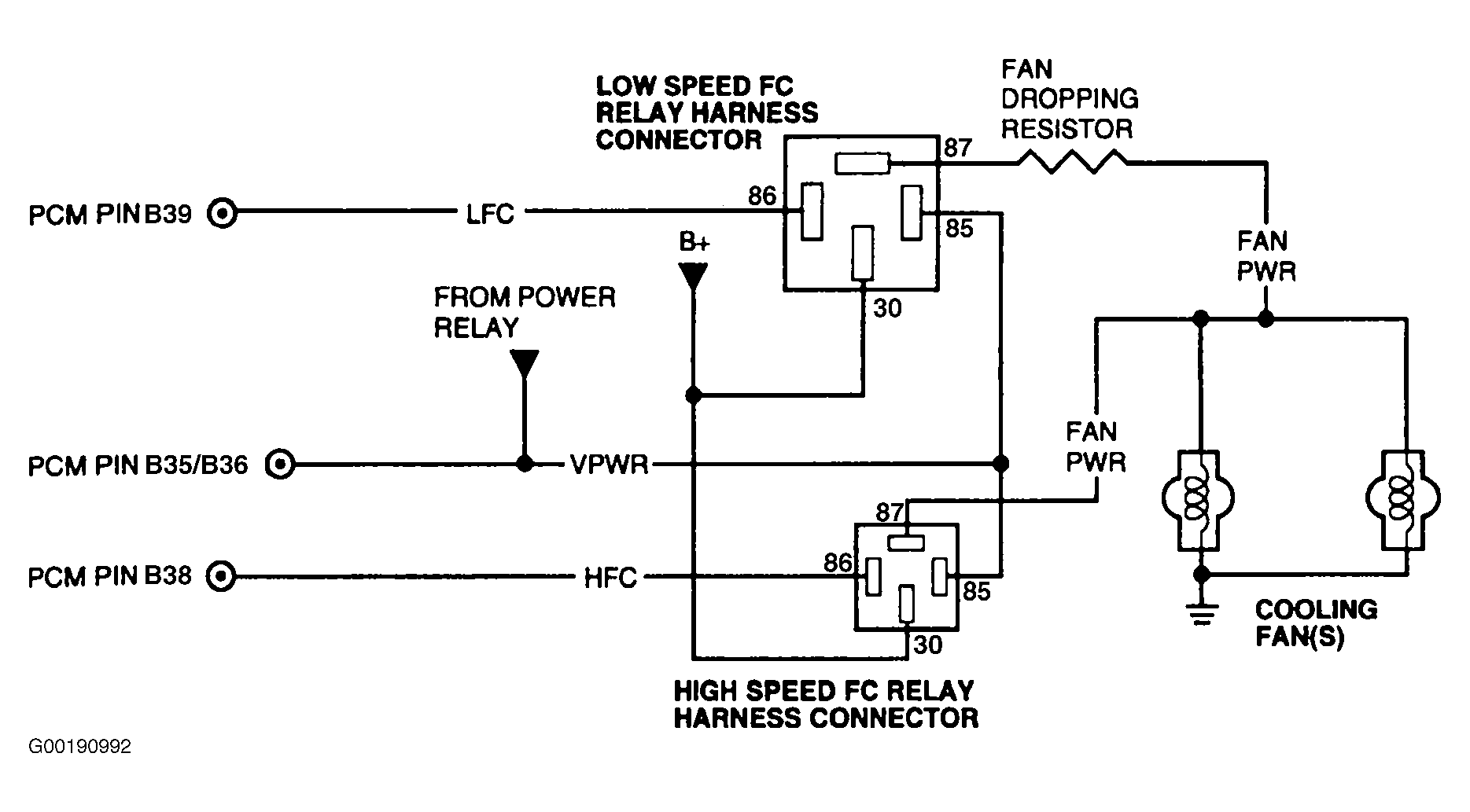 Disconnect both cooling fan harness connectors. Using a DVOM, measure resistance between chassis ground and FAN PWR circuit at cooling fan harness connector. If resistance is more than 10 k/ohms, go to next step. If resistance is 10 k/ohms or less, locate and repair short to ground in FAN PWR circuit. Recheck cooling fan operation. - 53) Check HFC & LFC Relay Operation