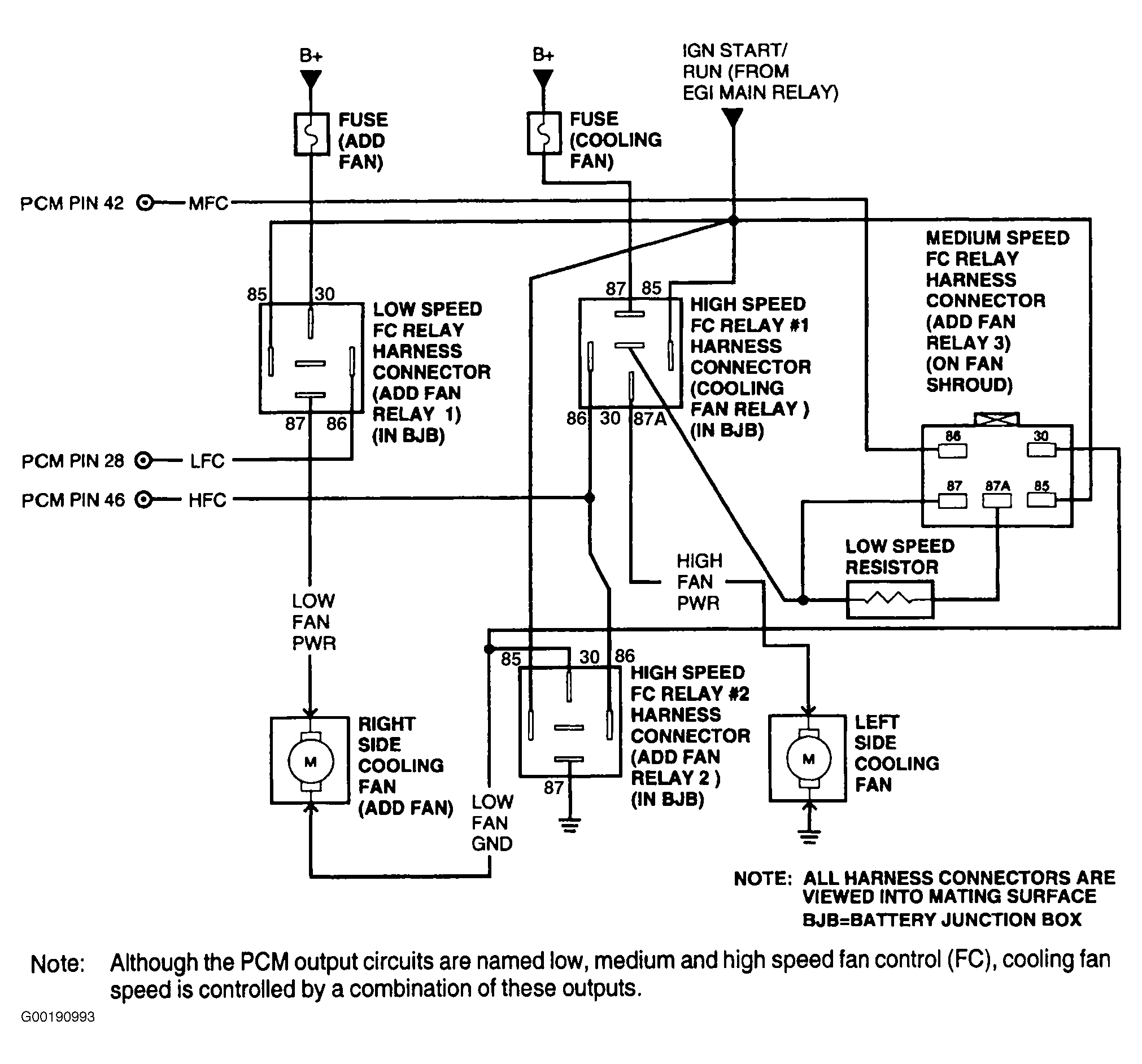 Ensure LFC and HFC relays are removed. Turn ignition switch to OFF position. Remove MFC relay from battery junction box located in engine compartment. Turn ignition switch to ON position. Check cooling fan operation. If cooling fan does not continue to operate, turn ignition switch to OFF position and replace MFC relay. Recheck cooling fan operation. If both cooling fans continue to operate, turn ignition switch to OFF position and repair short to PWR in HIGH FAN PWR circuit. See Figure. If only one cooling fan continues to operate, turn ignition switch to OFF position and repair short to PWR in either LOW FAN PWR or MEDIUM FAN PWR circuit at appropriate fan.NOTE: A break in step numbering sequence occurs at this point. Procedure skips from step 68) to step 70). No test procedures have been omitted. - 70) One Cooling Fan Inoperative & Other Cooling Fan Operates Normally (No DTCs): Check For Open In Ground Circuit To Inoperative Cooling Fan