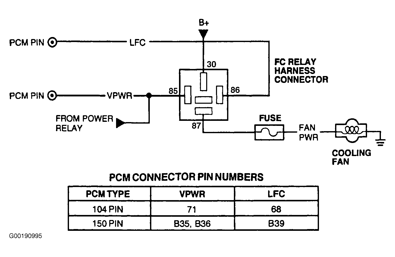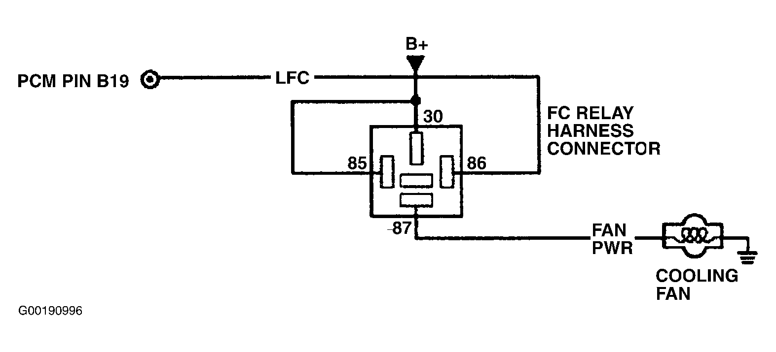 Turn ignition switch to OFF position. Remove LFC relay (ADD FAN). See COOLING FAN RELAY LOCATIONS table. Using a DVOM, measure voltage between negative battery cable and B+ circuit at LFC relay cavity. See Figure or Figure . If voltage is more than 10.5 volts, go to next step. If voltage is 10.5 volts or less, check for open in B+ circuit. Check appropriate B+ circuit fuse. If fuse is okay, check for open in B+ circuit. Repair as necessary. If fuse is blown, check B+ and FAN PWR circuits for short to ground before replacing fuse. Repair as necessary. Recheck cooling fan operation. - 111) Command Low Speed Fan ON & Check For B+ To Passenger's Side Cooling Fan