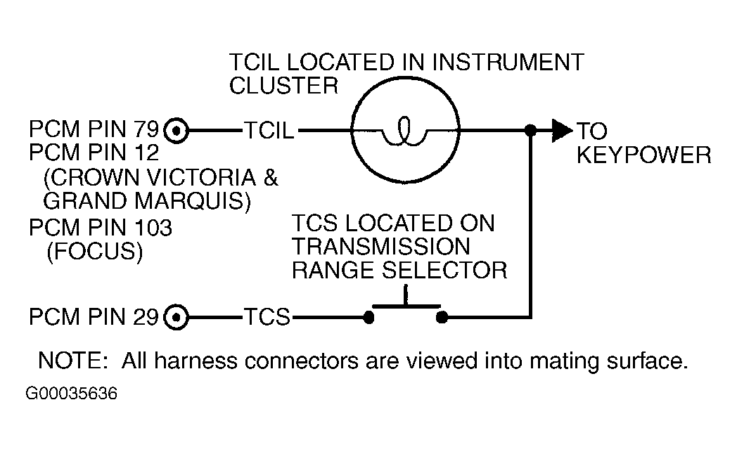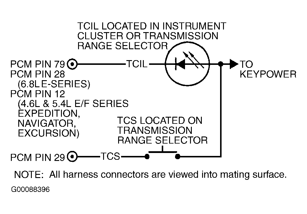 Using a DVOM, measure resistance between TCS and VPWR circuits at PCM harness connector. If resistance is more than 10 k/ohms, replace faulty TCS. If resistance is 10 k/ohms or less, repair short to VPWR in TCS circuit. - 6) TCIL Always ON With Engine Running (No DTCs): Check TCIL Function