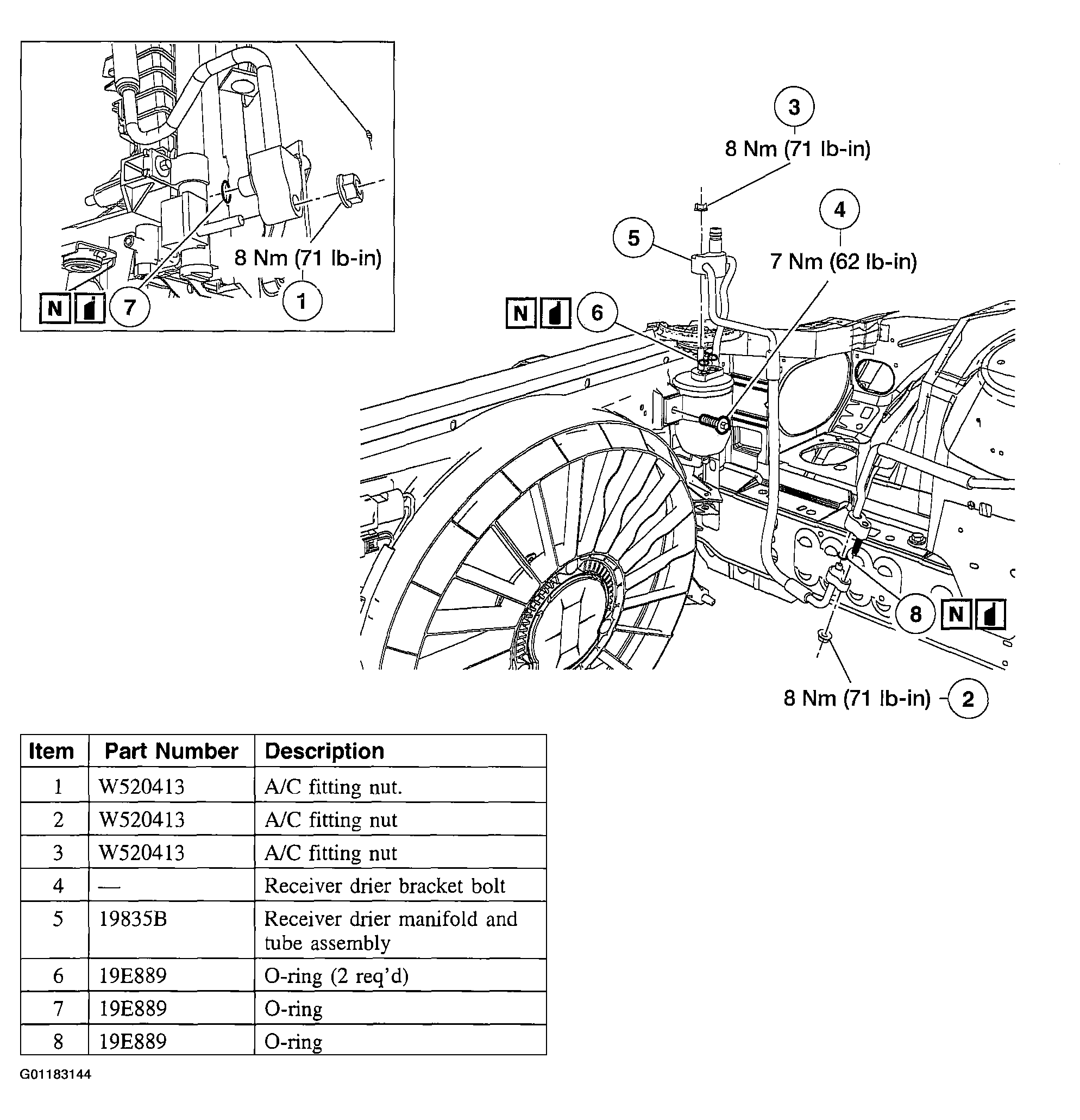 New O-ring seals, lubricated in clean PAG oil, must installed before reconnecting any A/C fitting that has been disconnected.