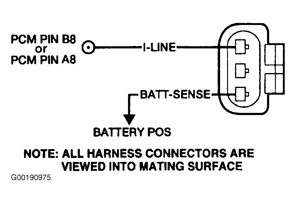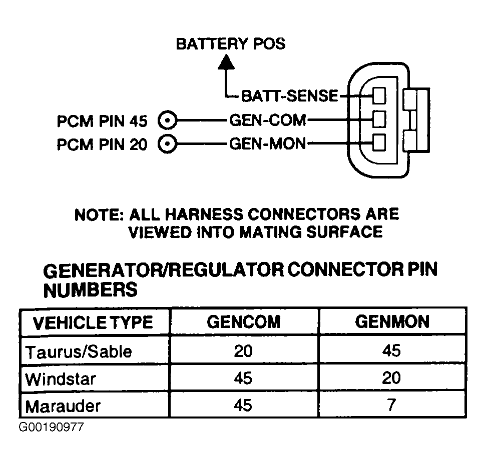 Turn ignition switch to OFF position. Disconnect negative, then positive battery cable. Disconnect generator connector. Using a DVOM, measure resistance between BATT-SENSE and GEN-COM circuits at generator connector (except LS and Thunderbird). For LS and Thunderbird, measure resistance between GEN-MON and ground. See Figure-Figure . If resistance is 950-1050 ohms (except LS and Thunderbird) or 53-203 ohms (LS and Thunderbird), go to next step. If resistance is not as specified, replace generator/regulator assembly. - 3) Check Battery Sense Voltage At Battery