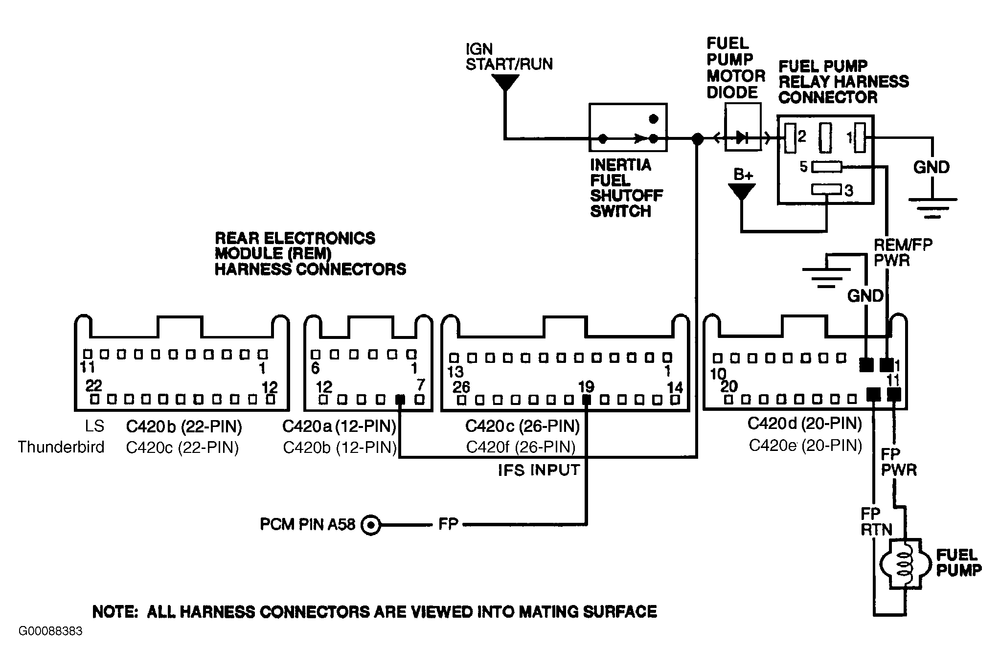 55. NOTE: On LS, B+ circuit fuse to fuel pump relay is No. 417 (15-amp). On Thunderbird, B+ circuit fuse to fuel pump relay is No. 418 (20-amp).