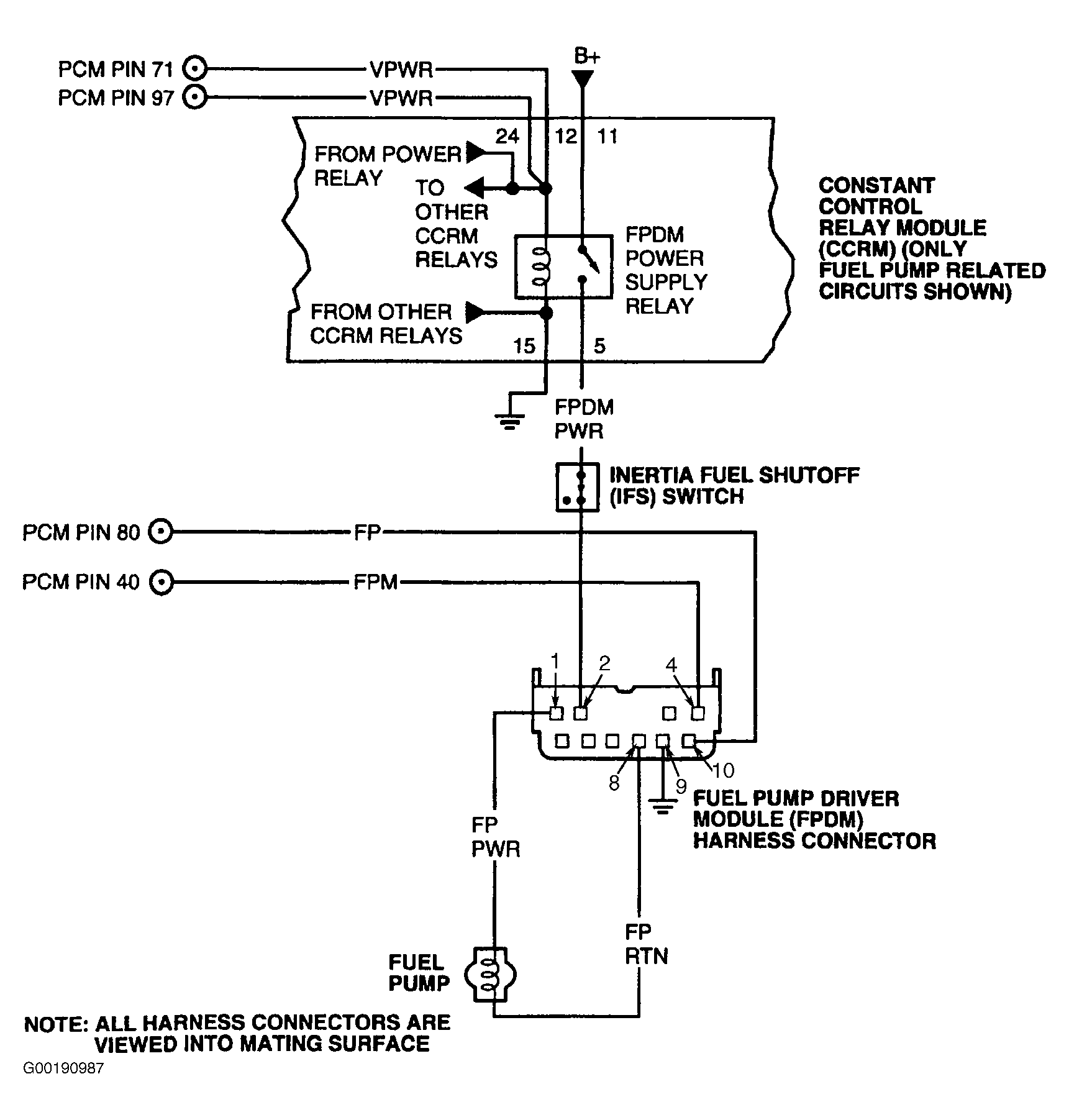 Turn ignition switch to OFF position. Disconnect FPDM connector. Disconnect PCM connector(s). Inspect connector for loose, damaged or corroded terminals. Repair as necessary. Using a DVOM, measure resistance of FP circuit between PCM harness connector and FPDM harness connector (REM on LS and Thunderbird). See Figure-Figure . If resistance is less than 5 ohms, go to next step. If resistance is 5 ohms or more, repair open in FP circuit.