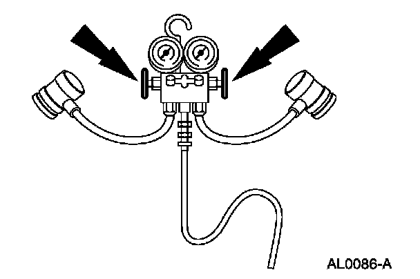 1. Turn both valves on the R-134a Manifold Gauge Set all the way to the left to close the low-pressure and high-pressure hoses to the center manifold and center hose.