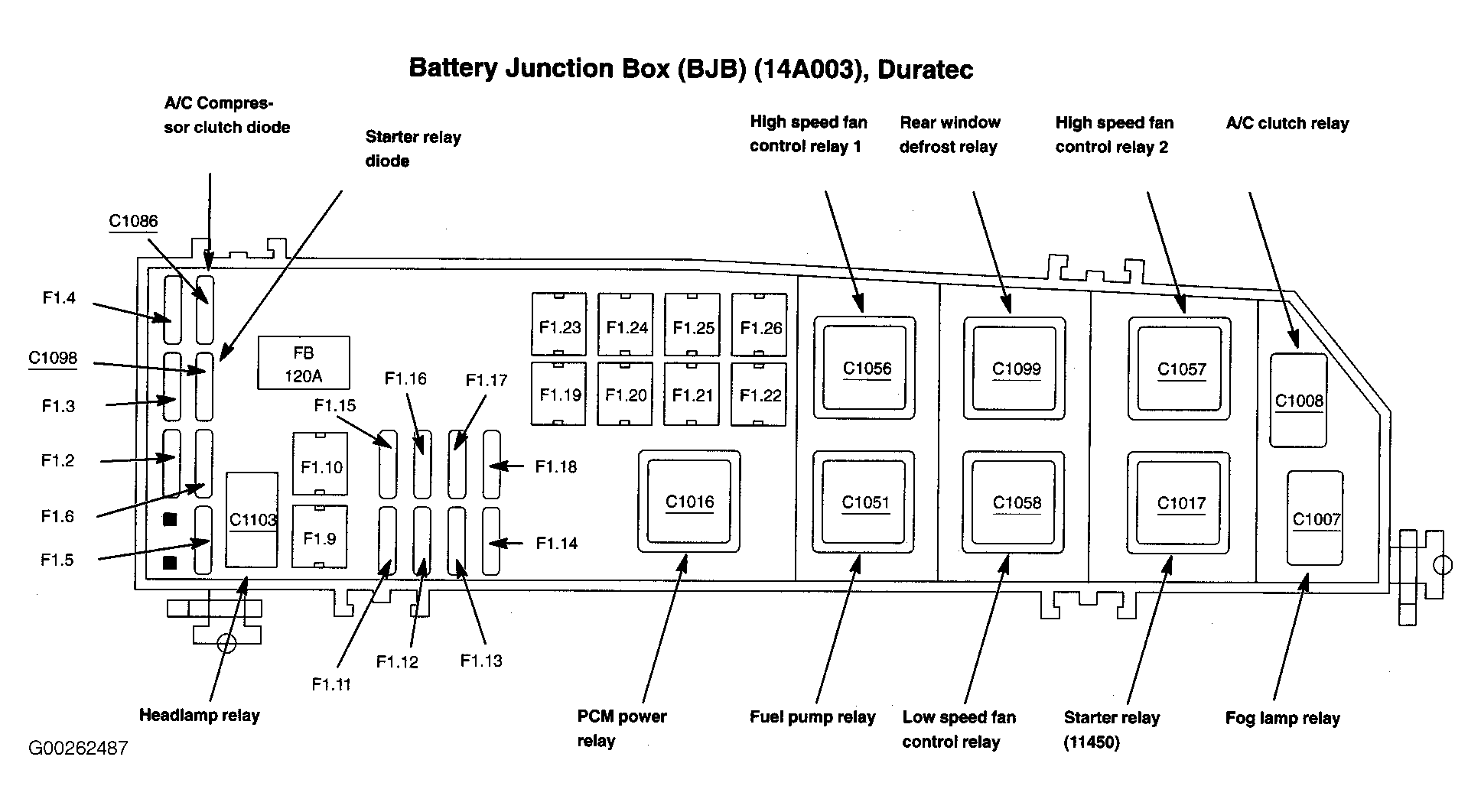 Battery Junction Box (BJB) On left front corner of engine compartment. See Figure .