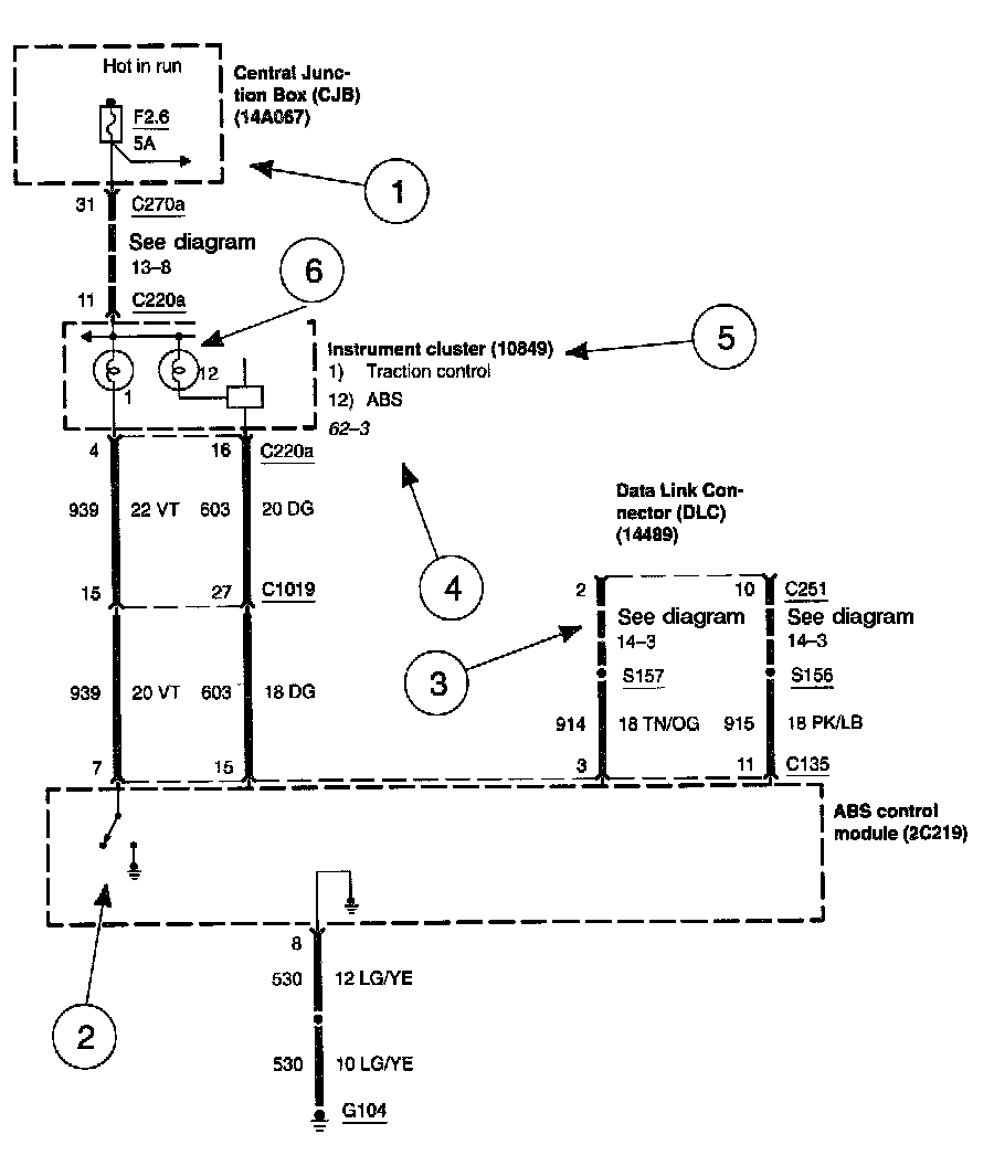 Each set of diagrams normally starts with the component that powers the circuit such as a fuse or the ignition switch. Current flow is shown from the power source at the top of the diagram to ground at the bottom of the diagram. In order to concentrate on the essential parts, power supply and ground connections are sometimes simplified by a dashed line in the diagrams. A full representation of the power supply of a fuse or the power distribution from a fuse to various components is given in the Power and Ground Distribution Diagrams. Full representation of the ground connections are shown in the Power and Ground Distribution Diagrams.