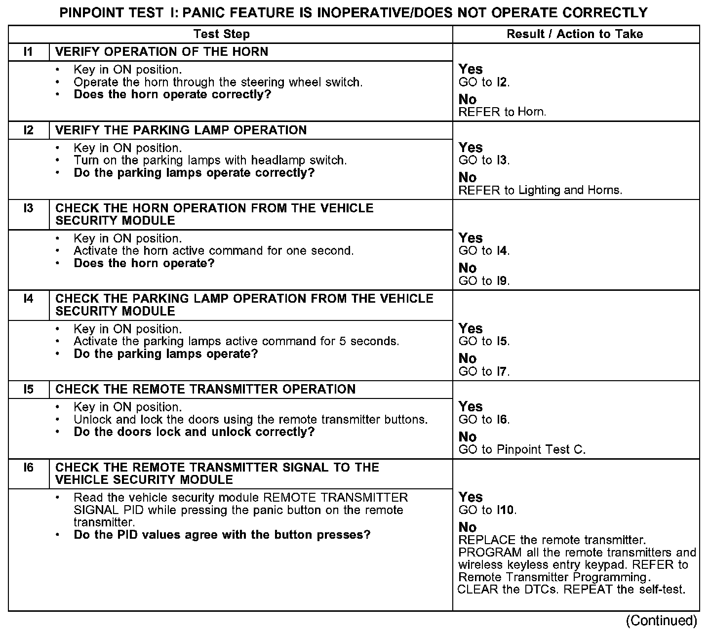 PINPOINT TEST I: PANIC FEATURE IS INOPERATIVE/DOES NOT OPERATE CORRECTLY