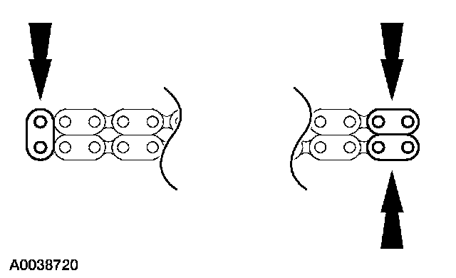 LH timing chain on the camshaft sprocket with the two chain (marked) links and the timing marks aligned.