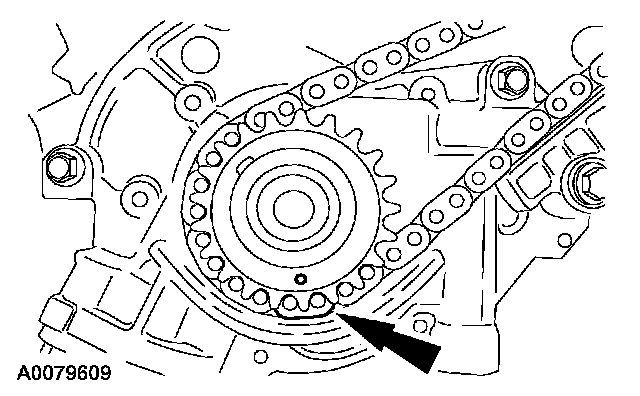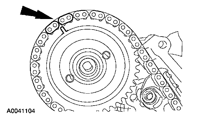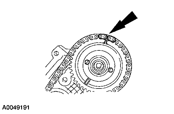 Position the timing chain on the camshaft sprocket. Make sure the two copper-colored (marked) links align with the camshaft sprocket timing mark.