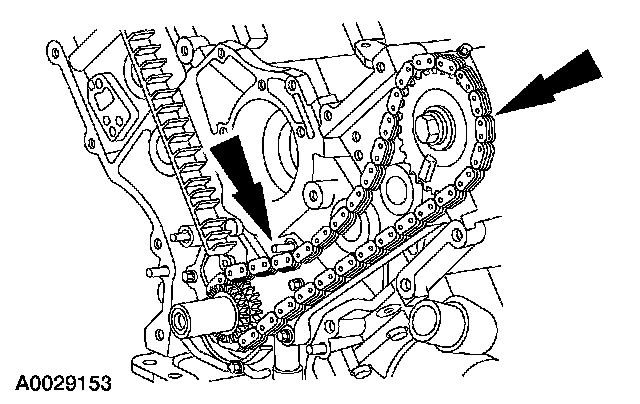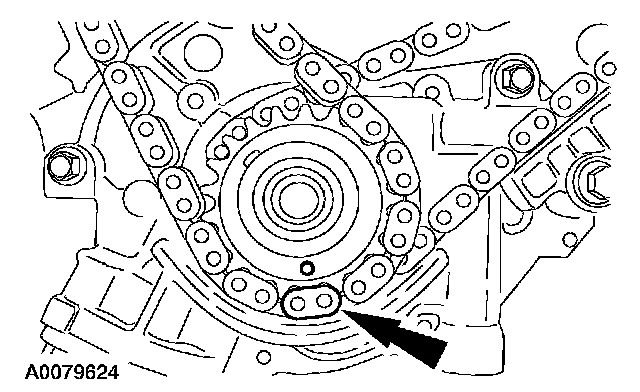 Be sure the RH (outer) timing chain on the crankshaft sprocket chain link and crankshaft sprocket timing marks are aligned.