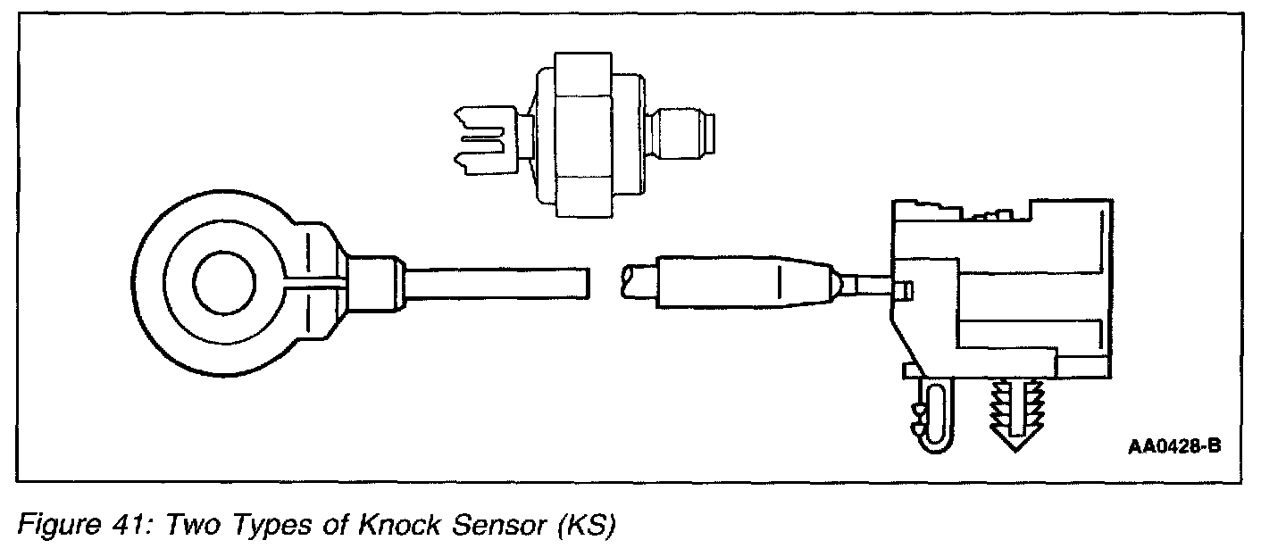 The knock sensor (KS) (Figure 41) is a tuned accelerometer on the engine which converts engine vibration to an electrical signal. The PCM uses this signal to determine the presence of engine knock and to retard spark timing.