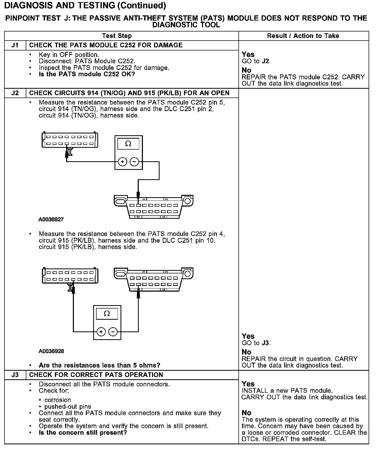 PINPOINT TEST J: THE PASSIVE ANTI-THEFT SYSTEM (PATS) MODULE DOES NOT RESPOND TO THE DIAGNOSTIC TOOL
