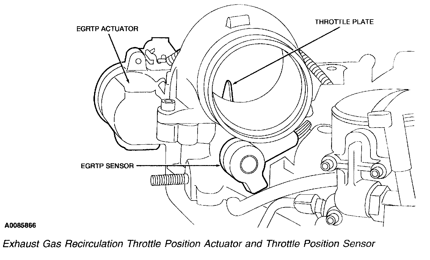 The EGR throttle position (EGRTP) actuator modifies the intake airflow from the charge air cooler into the intake manifold. The EGRTP actuator regulates the rotary motion of the throttle plate located within the throttle body. The control of intake airflow provides increased EGR system efficiency with the throttle plate position determined by a signal from the EGRTP sensor.