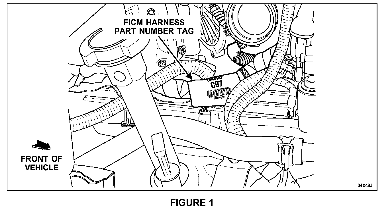 2. Inspect the FICM harness for a part number tag. If present, it will be located between two (2) of the fuel injector harness takeouts. See Figure 1.