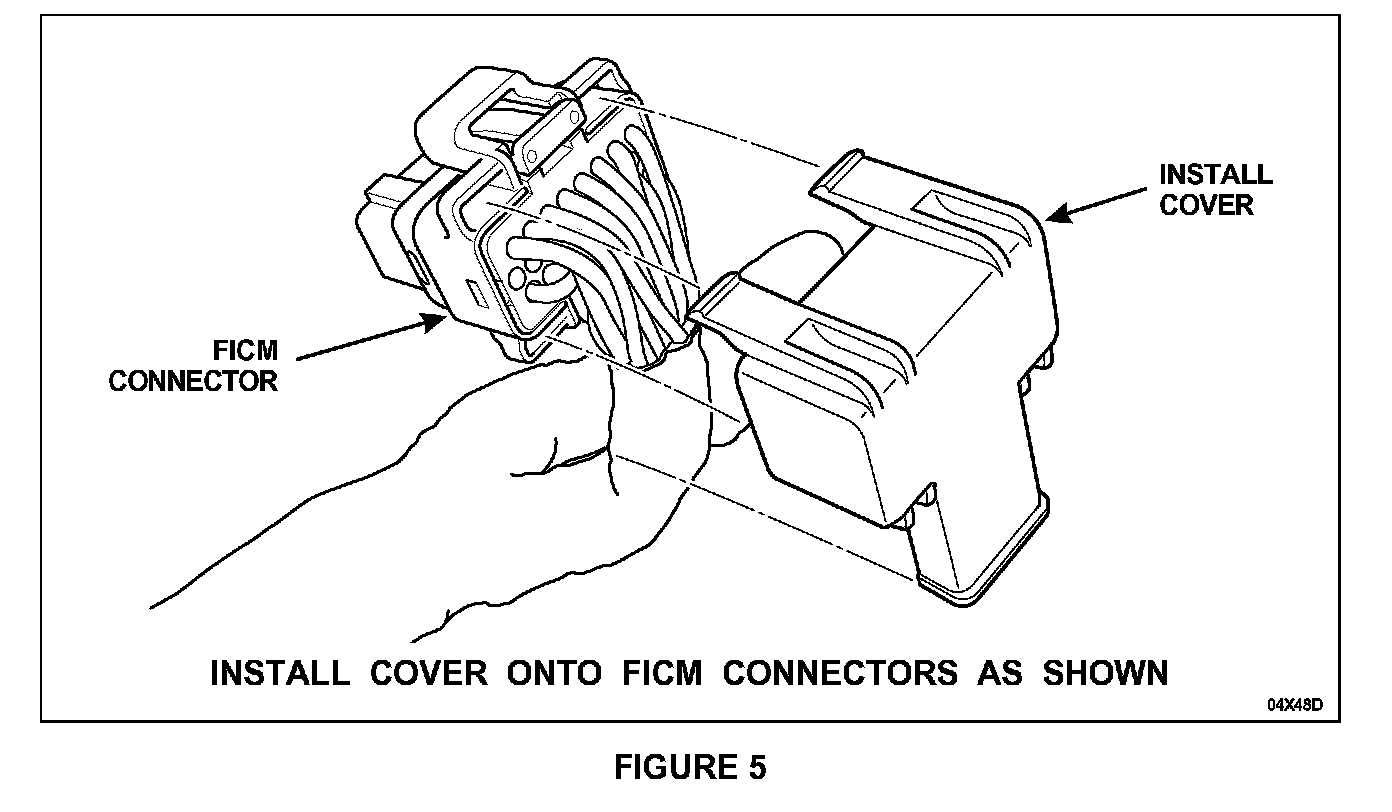 1. Install the harness connector covers onto both FICM injector harness connectors by carefully bending the wires coming out of the connector and snapping the cover in place. See Figure 5.