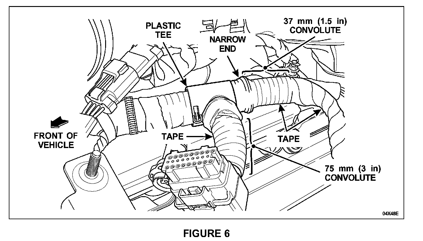 4. Position the 75 mm (3 inches) section of convolute over the harness takeout from the plastic TEE to the FICM connector. See Figure 6.