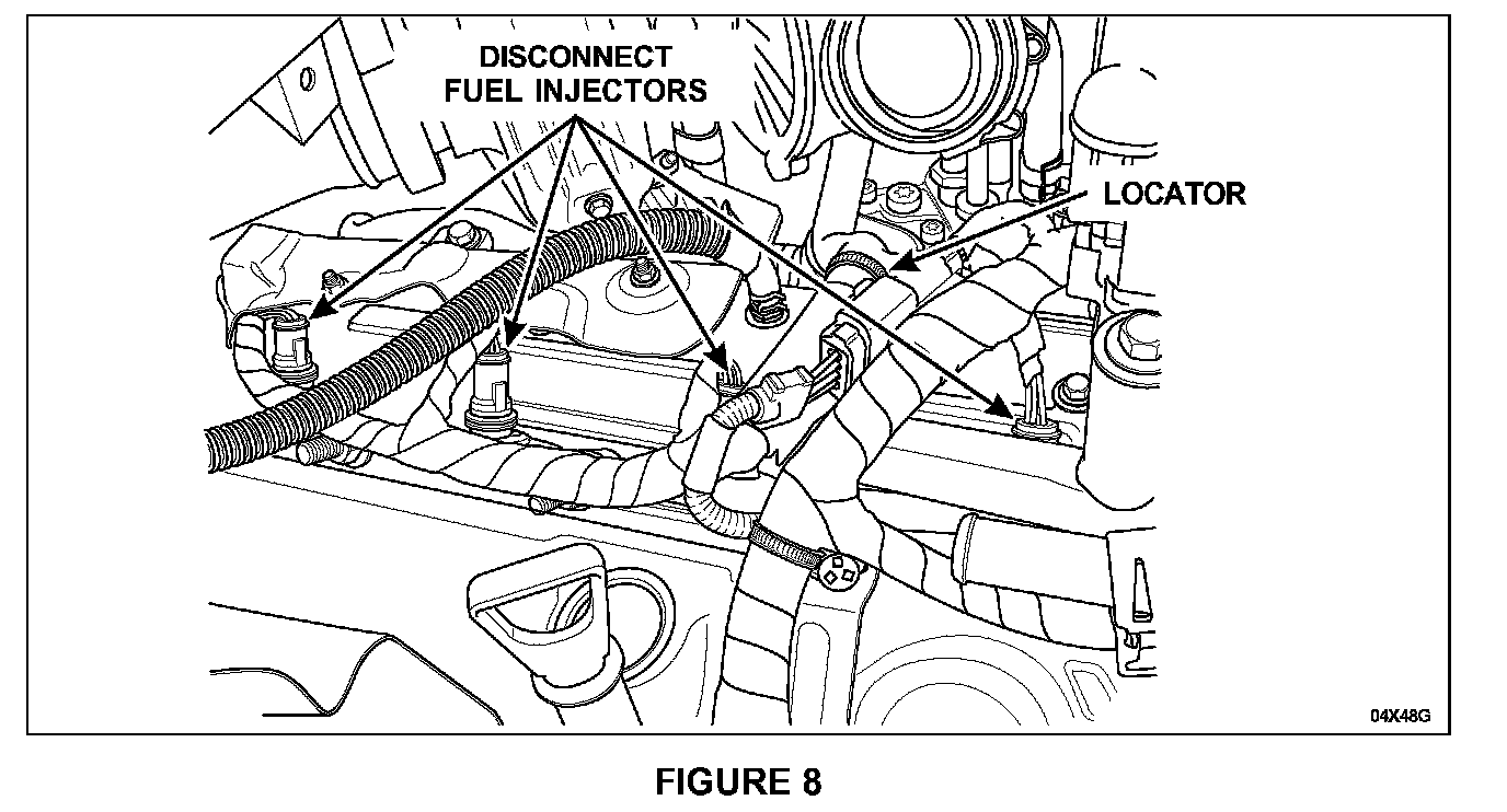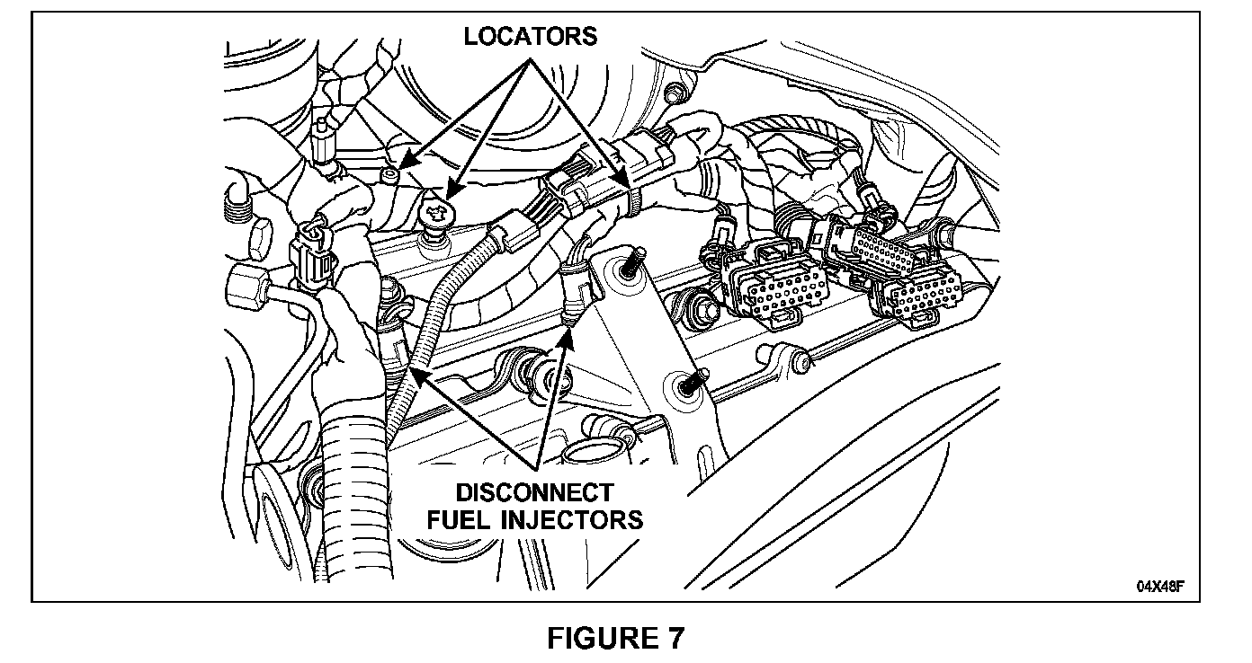2. Disconnect the remaining two (2) fuel injectors on the driver side along with three (3) wire harness locators (two [2] located along the fuel injector manifold assembly and one (1) located underthe turbocharger). See Figure 7.