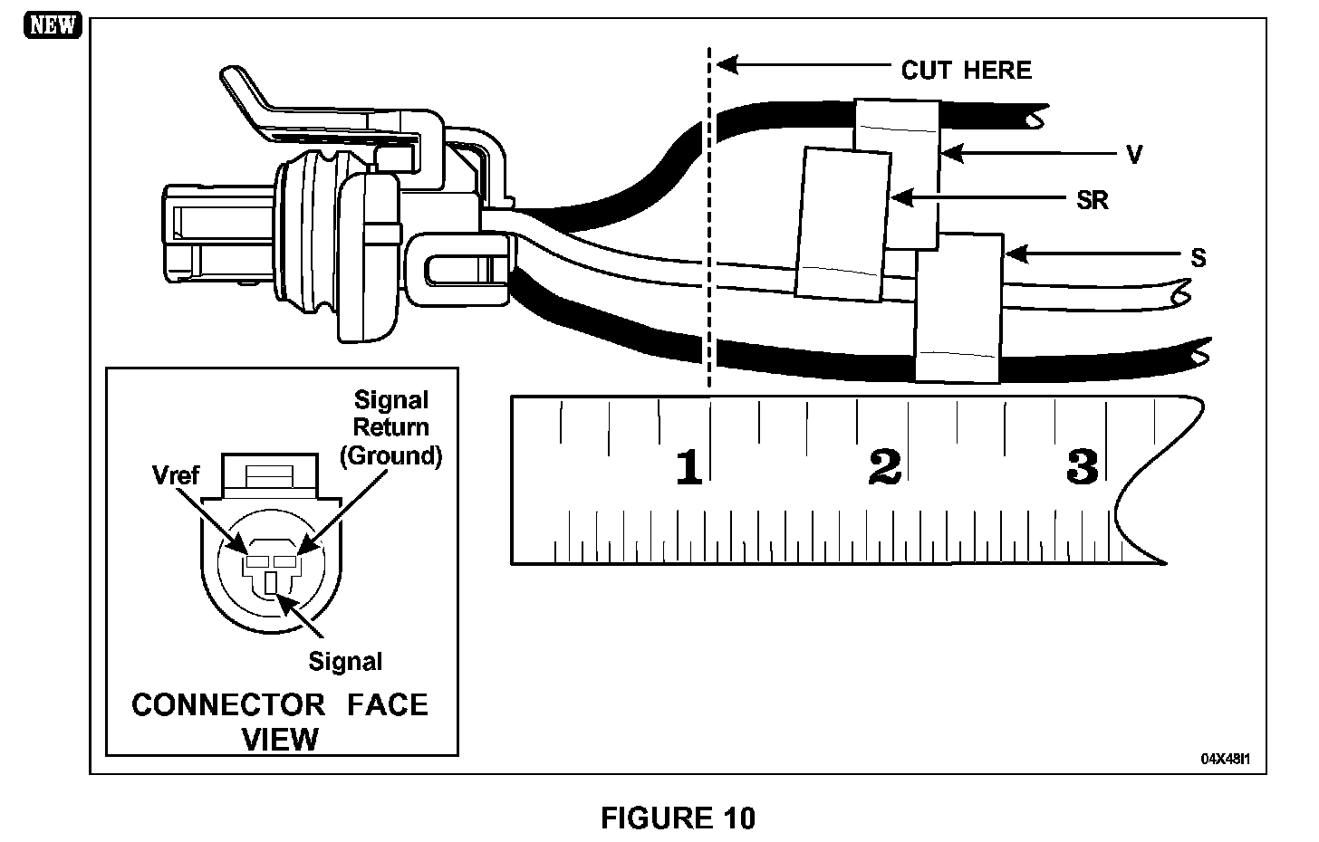 4. Cut the wires about 25 mm (1 inch) behind the connector on the vehicle harness MAKING SURE TO LEAVE THE IDENTIFYING TAGS ON THE HARNESS and discard the old connector. See Figure 10.