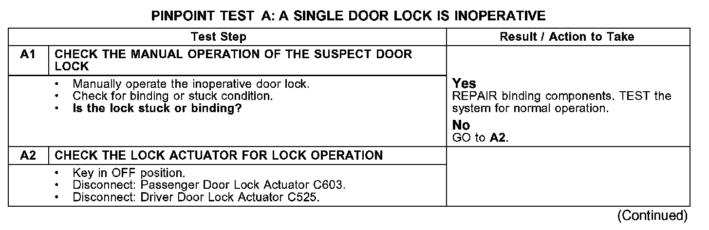 PINPOINT TEST A: A SINGLE DOOR LOCK IS INOPERATIVE