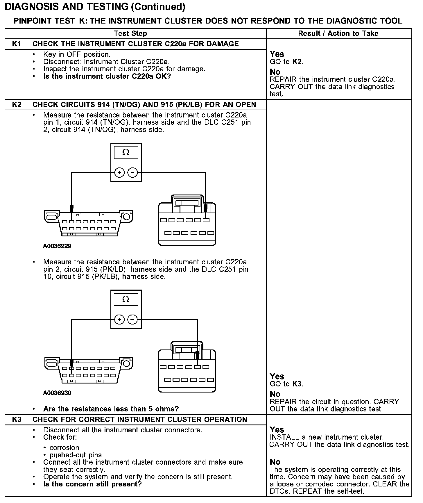 PINPOINT TEST K: THE INSTRUMENT CLUSTER DOES NOT RESPOND TO THE DIAGNOSTIC TOOL