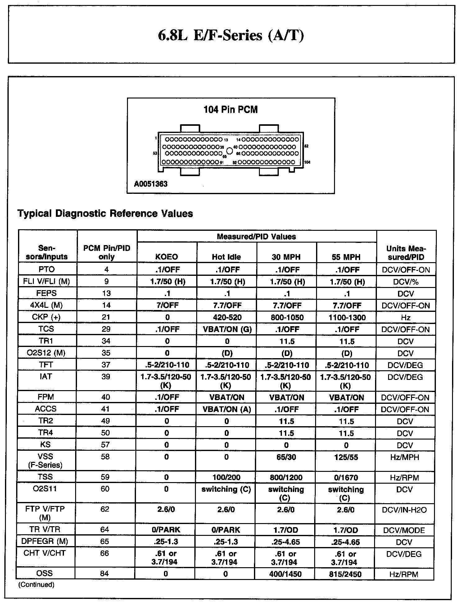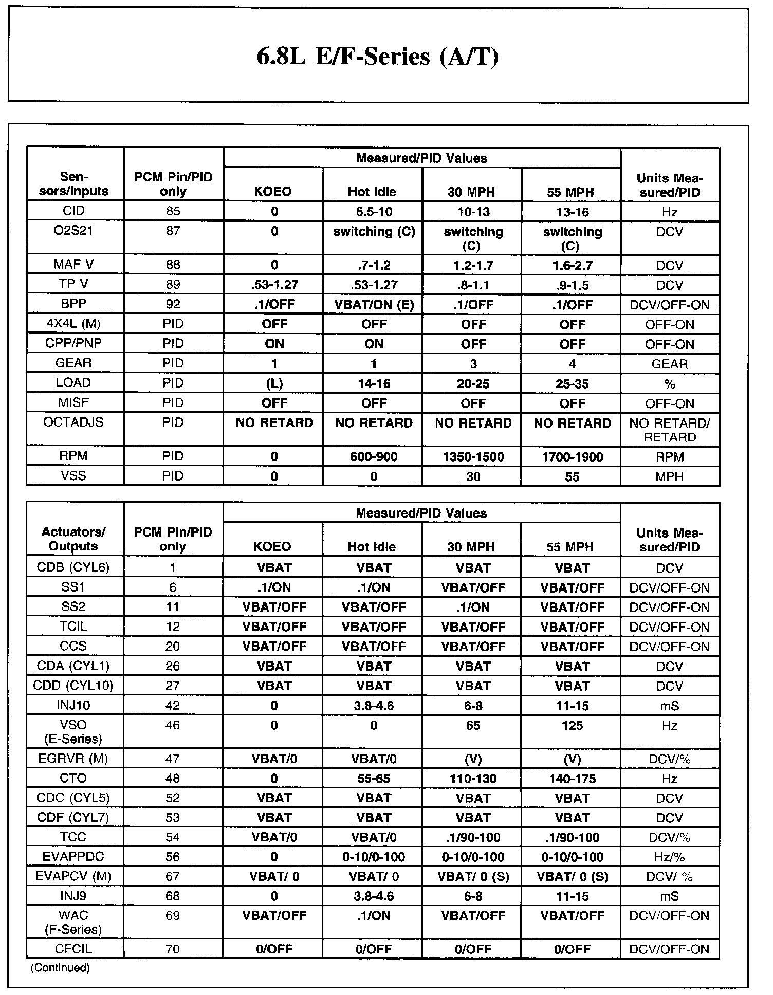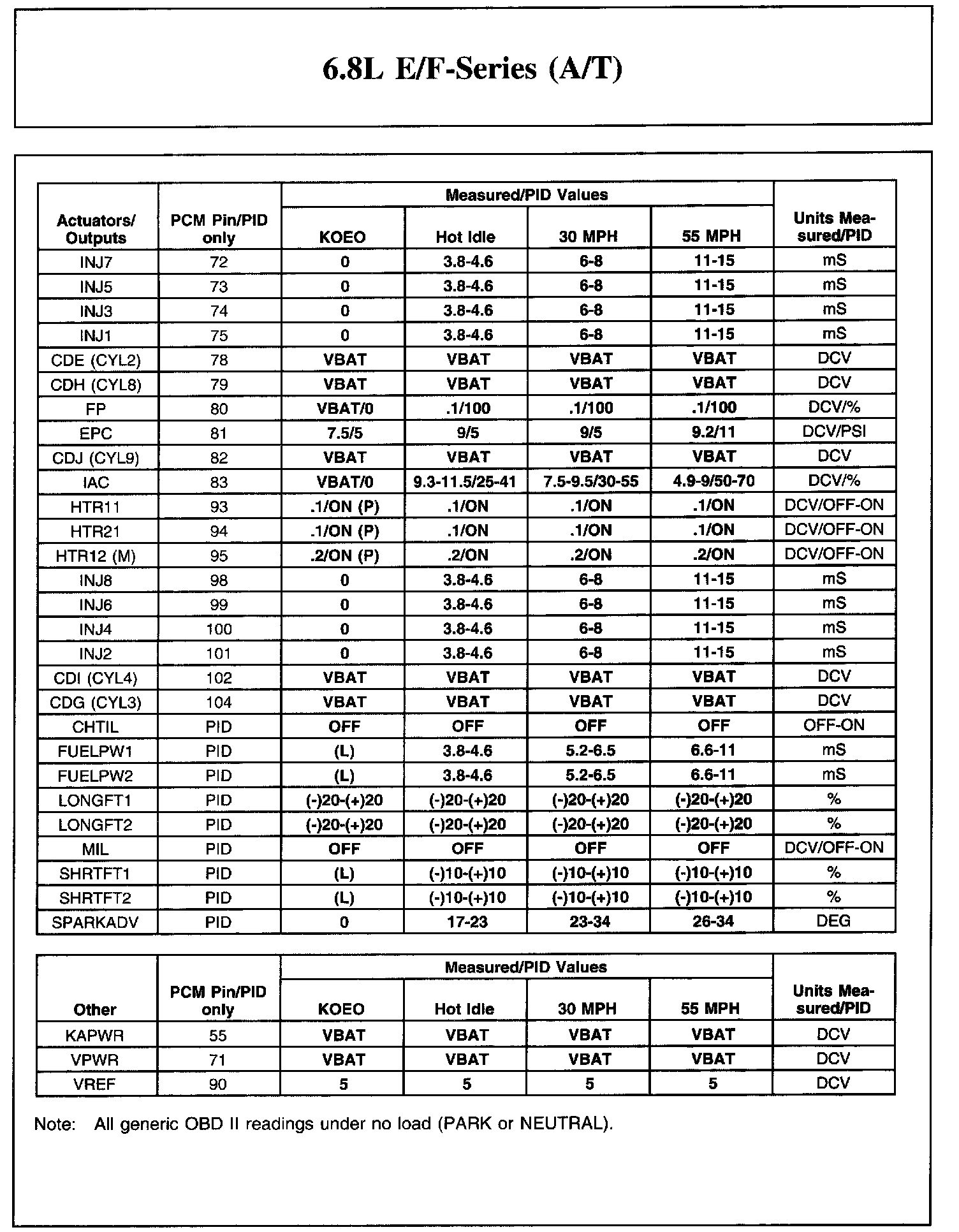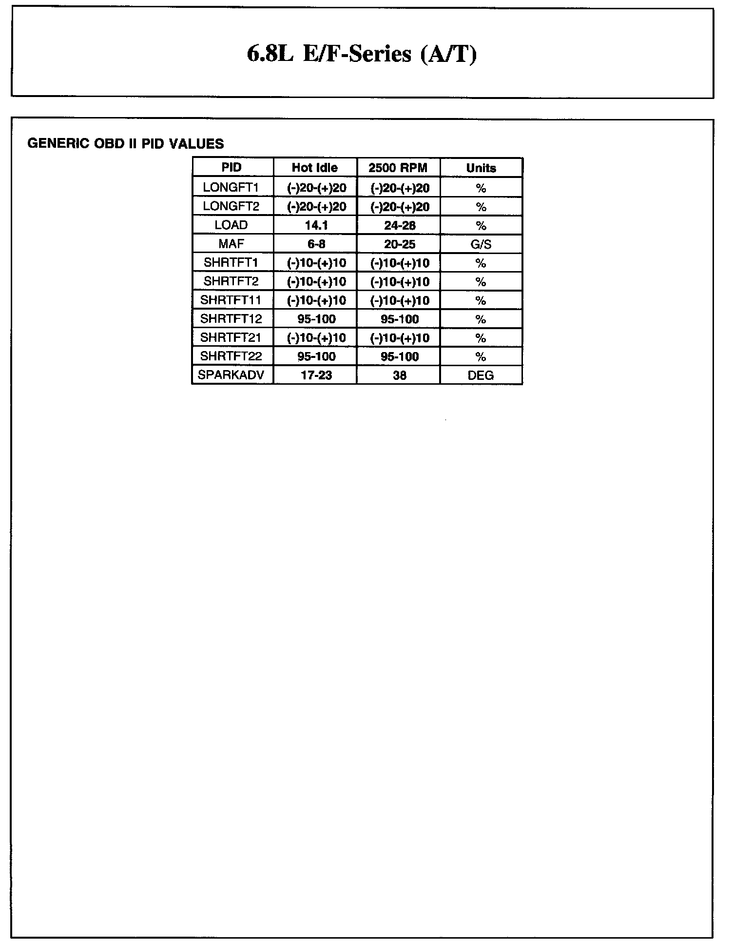 Home >> Ford >> 2004 >> Excursion 4WD V10-6.8L VIN S >> Repair and Diagnosis >> Powertrain Management >> Computers and Control Systems >> Testing and Inspection >> Scan Tool Testing and Procedures >> Reference Values >> Typical Diagnostic Reference Values >> 6.8L E/F-Series (A/T)